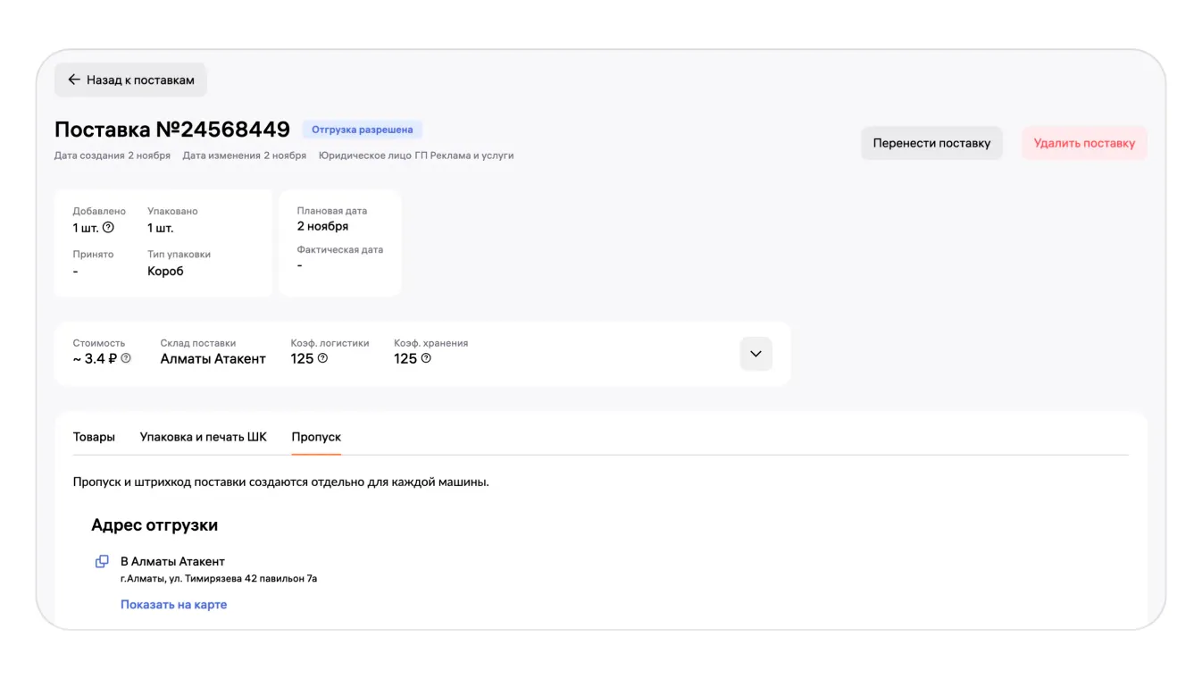 Для отгрузки поставки на некоторые склады (СЦ) нужно оформить пропуск. Проверить, нужен ли пропуск, можно на карте складов.