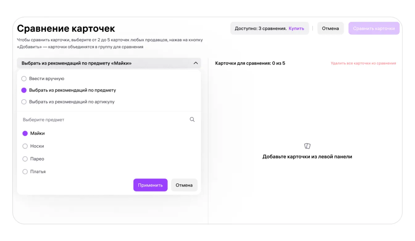 Выберите опцию и введите артикул WB карточки, которую будете сравнивать.