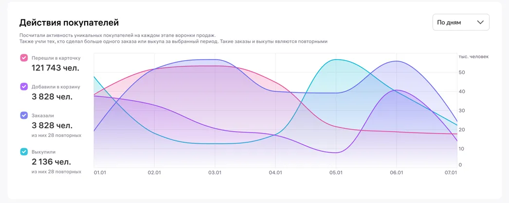 Вы узнаете, сколько человек, открывших ваши карточки, положили товары в корзину, заказали и выкупили их. Данные можно смотреть по дням, неделям и месяцам. Учитываем и повторные заказы, то есть когда один и тот же покупатель что-то заказывает в разные дни периода.