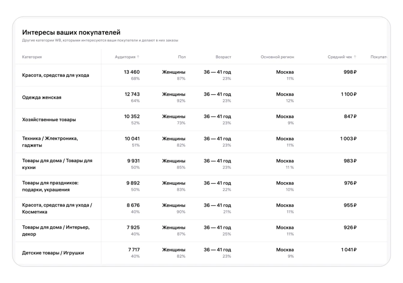 С его помощью можно узнать, кто ваши покупатели, на какую сумму и когда они делают заказы, какими ещё категориями товаров интересуются. Мы учитываем данные всех, кто покупает у вас, и их поведение на маркетплейсе в целом. Также отчёт поможет вам: