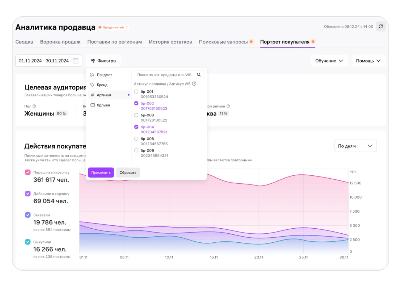 Если нужен более детальный анализ, используйте фильтры по предмету, бренду, ярлыку, а также по артикулу продавца и артикулу WB.