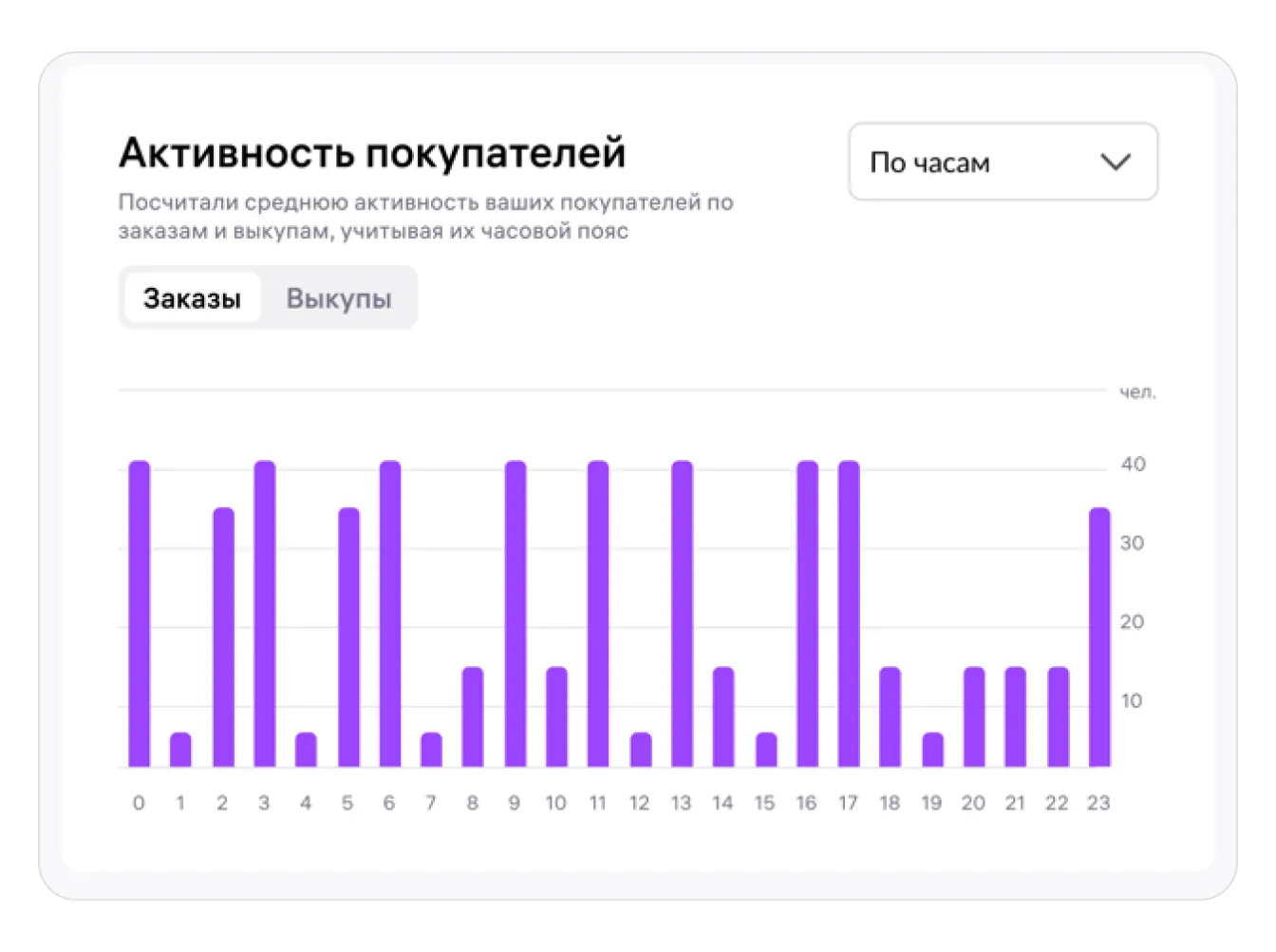 Здесь показано, в какое время суток и дни недели ваши покупатели делают заказы и выкупают товары. Данные по часовому поясу покупателей.