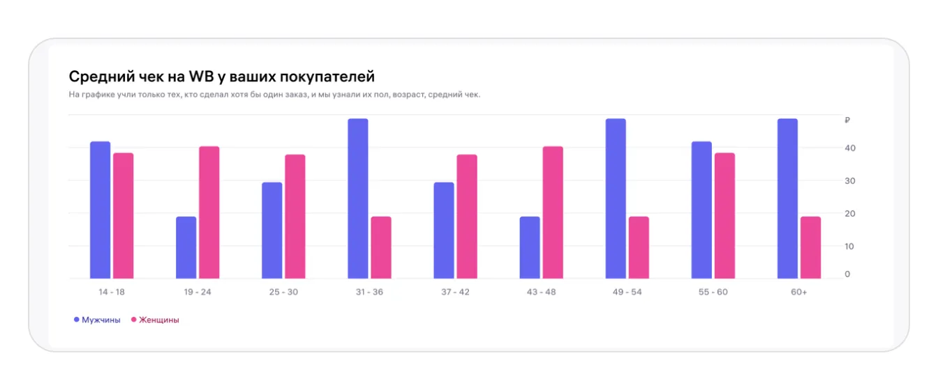 Многие покупатели не указывают на Wildberries свои данные, поэтому мы составляем их портрет по поведению и покупкам на платформе. Также стоит учитывать, что на некоторых виджетах возможна формулировка «Нет данных». Она означает, что мы не смогли узнать пол, возраст и регион у части покупателей, но всё равно включили их в виджет.