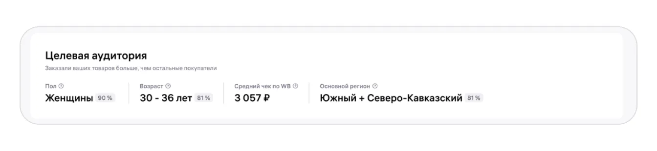 Многие покупатели не указывают свои данные, поэтому мы составляем их портрет по поведению на Wildberries и покупкам в целом. На некоторых виджетах возможна формулировка «Нет данных»: это значит, мы не смогли узнать пол, возраст и регион у части покупателей, но всё равно посчитали их