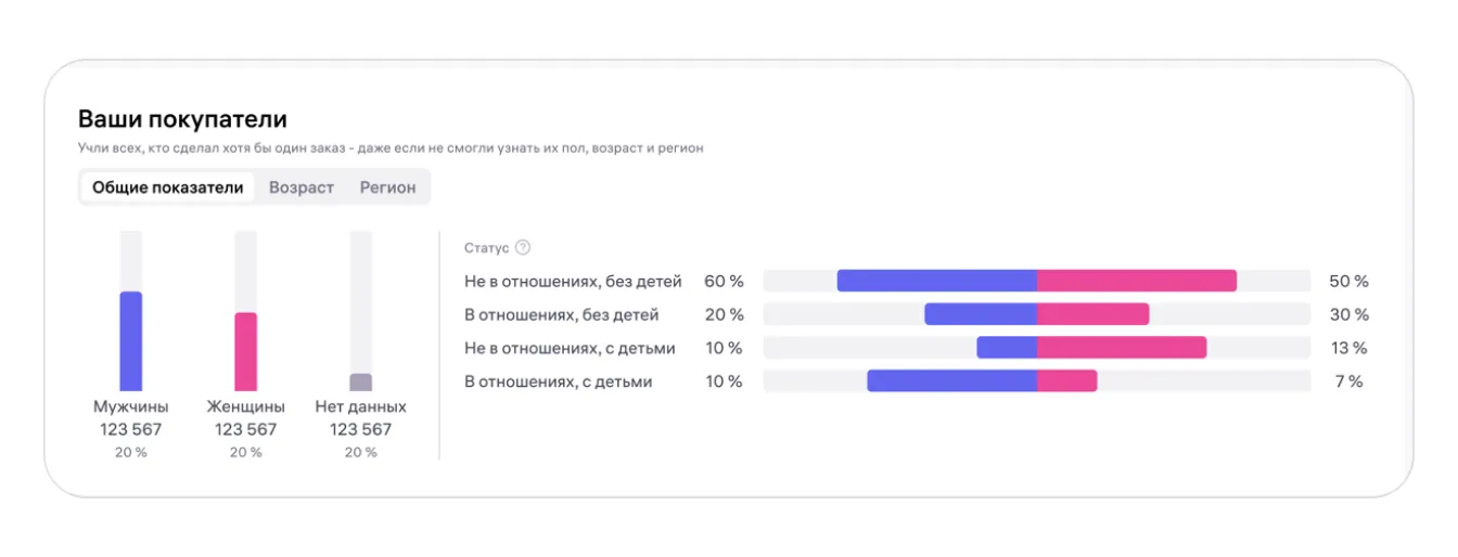 Посчитали всех, кто покупал у вас. Можно посмотреть возраст, регионы, где живут ваши покупатели, их пол и семейное положение.