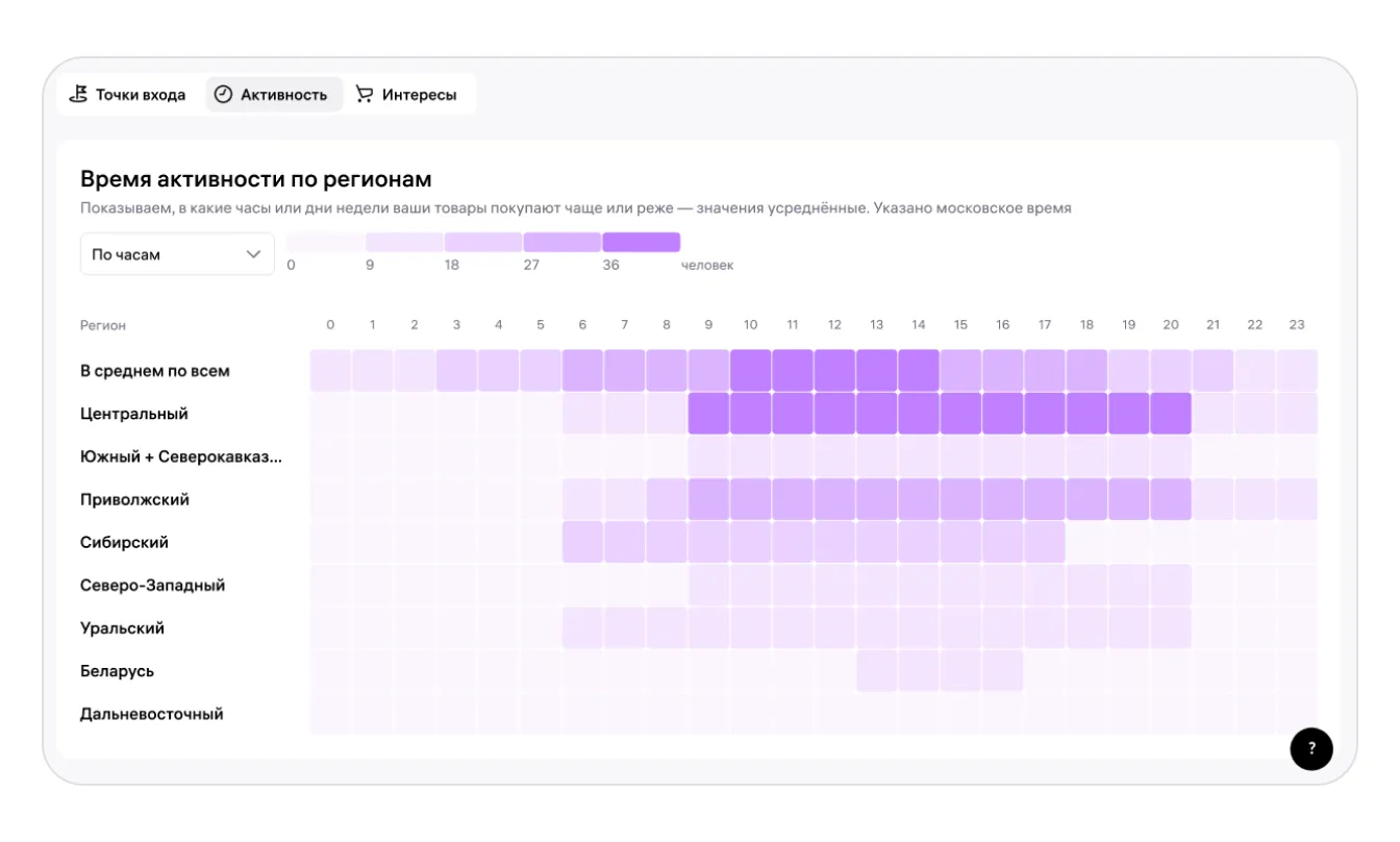 На тепловой карте «Активности» продавец детских товаров выявил два четких пика заказов по московскому времени: с 09:00 до 11:00 и с 20:00 до 23:00. Основной регион покупателей — Москва и область. Продавец перенёс запуск рекламных кампаний на эти часы и получил более высокую конверсию.