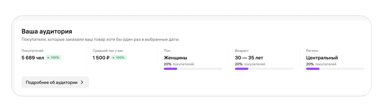 Чтобы увидеть детальную информацию о покупателях, нажмите «Подробнее об аудитории». Откроется окно с подробной статистикой по вашим покупателям. Эта информация поможет скорректировать ассортимент, оформить карточки товаров именно для вашей аудитории и выбрать правильные каналы для продвижения.