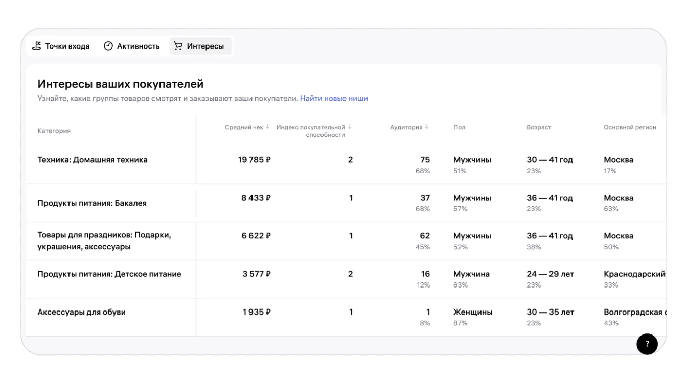 На вкладке «Интересы покупателей» продавец товаров для йоги увидел, что его аудитория — женщины 25–35 лет с высокой покупательской способностью — часто заказывают также товары из категорий «Ароматы для дома» и «Чаи и продукты для ЗОЖ». На основе этих данных продавец добавил в ассортимент ароматические свечи и травяные чаи, чтобы увеличить средний чек и лояльность аудитории.