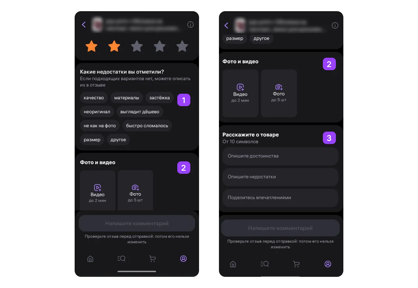 Дополнения к отзывам тоже проходят предварительную модерацию. Если покупатель сменит высокую оценку на низкую, ему также придётся оставить текстовое описание отзыва, указать недостаток или приложить фото или видео.