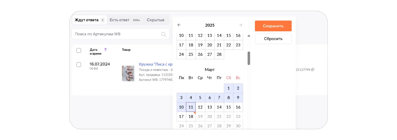 Отзывы в списке можно отфильтровать по дате или по оценке товара. Чтобы посмотреть отзывы за определённый период времени, нажмите на поле с календарём, выберите период и нажмите «Сохранить»:
