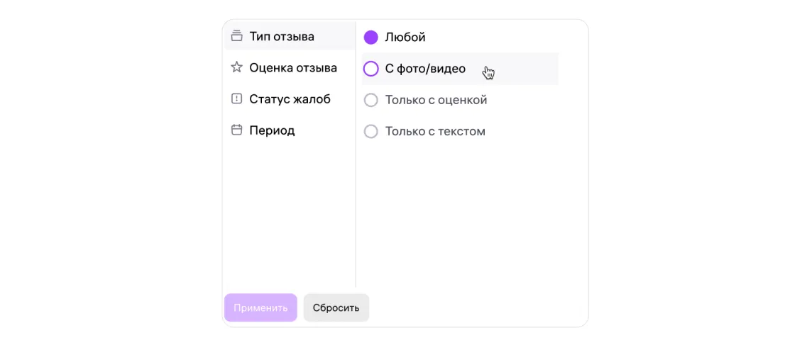 Чтобы посмотреть отзывы с фото или видео или отзывы, в которых есть только оценка или только текст, выберите тип отзыва: