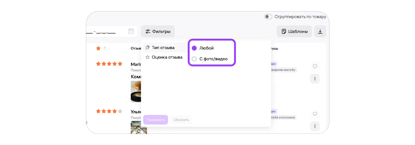 С помощью фильтра по типу отзыва можно отобразить только отзывы с фото и видео покупателей: