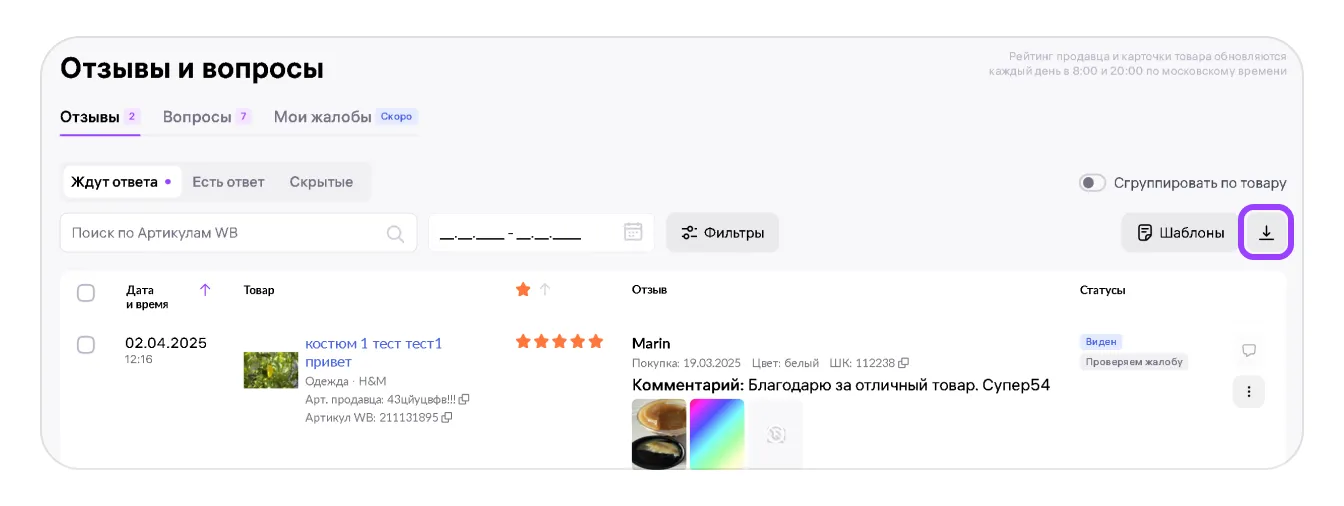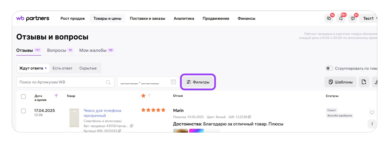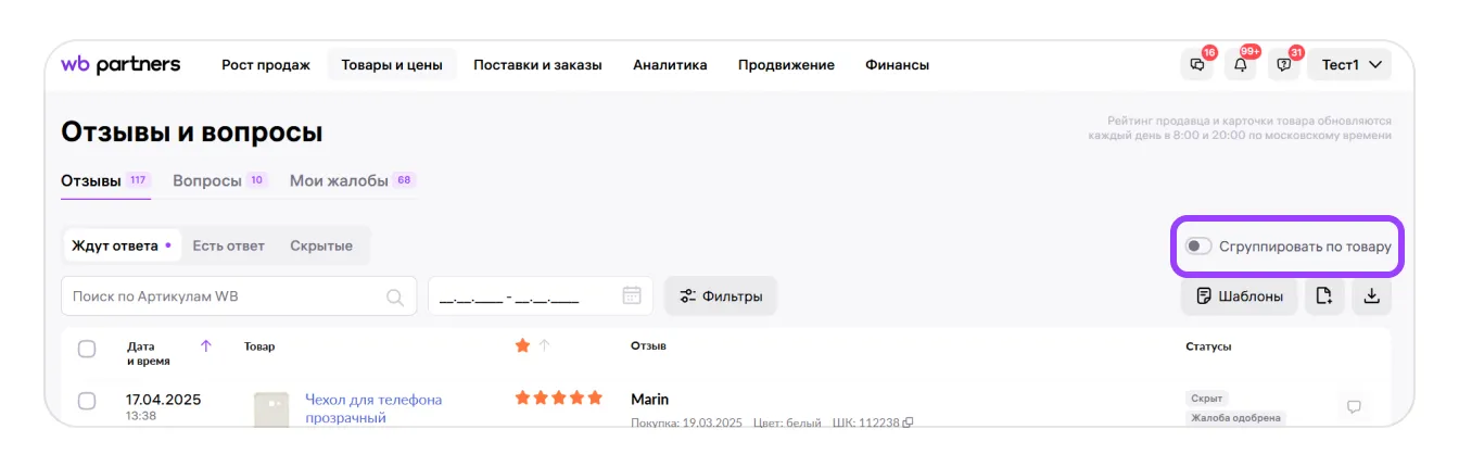 Фильтры и группировка по товарам срабатывают сразу на обе вкладки — отзывов с ответами и ожидающих вашего ответа