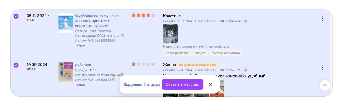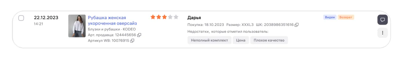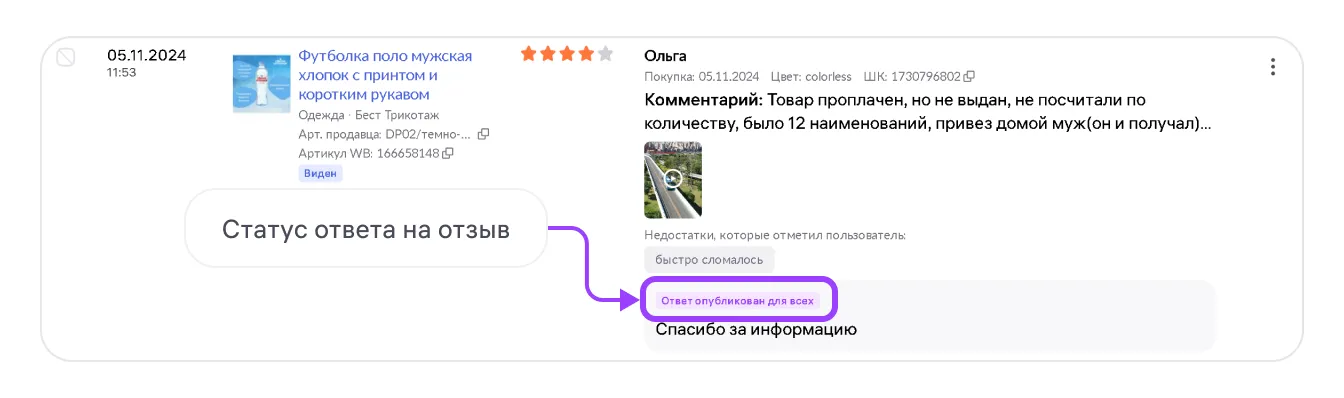 Для каждого отзыва в списке показаны дата выкупа товара, его вариант или цвет, ШК заказа, а также статусы отзыва и заказа в отдельном столбце. Если покупатель отдельно указал в отзыве недостатки товара, они также будут показаны: