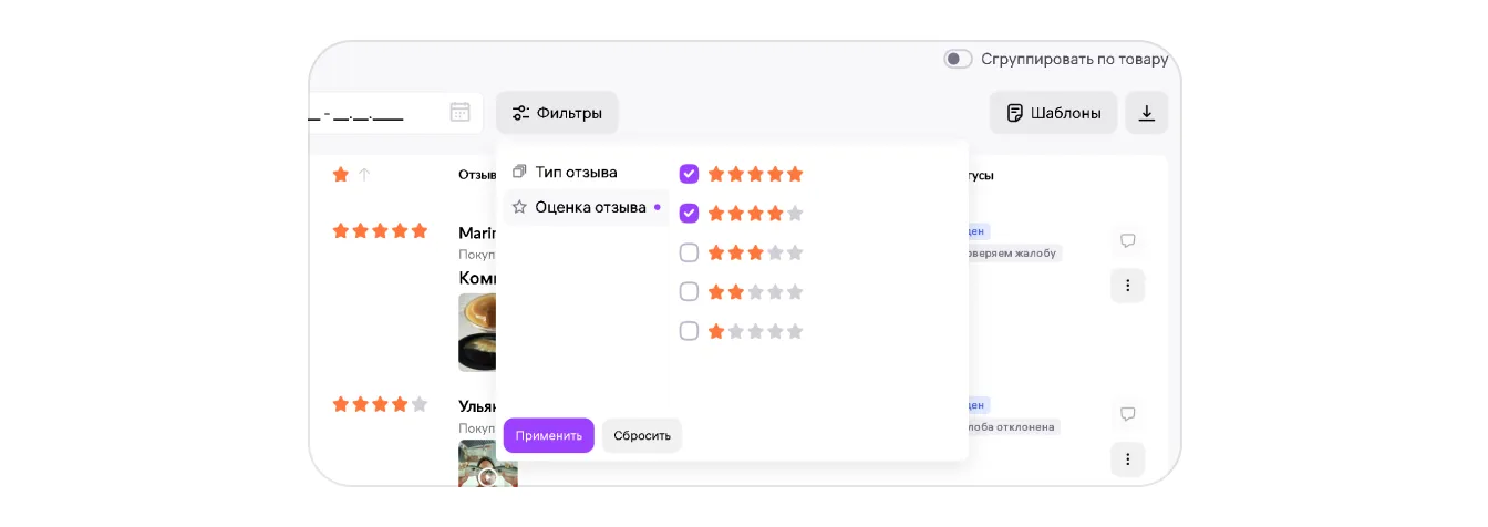 Для удобства вы можете сгруппировать отзывы по товарам, к которым они относятся — тогда вместо списка отзывов вы увидите список товаров, а все отзывы на один товар будут показаны вместе.