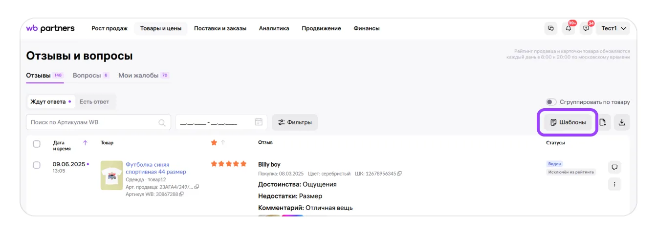 Перейдите во вкладку «Ждут ответа» и нажмите на строчку с нужным отзывом. В открывшейся боковой панели введите текст или выберите готовый шаблон ответа и нажмите «Ответить». Отзыв переместится на вкладку «Есть ответ».