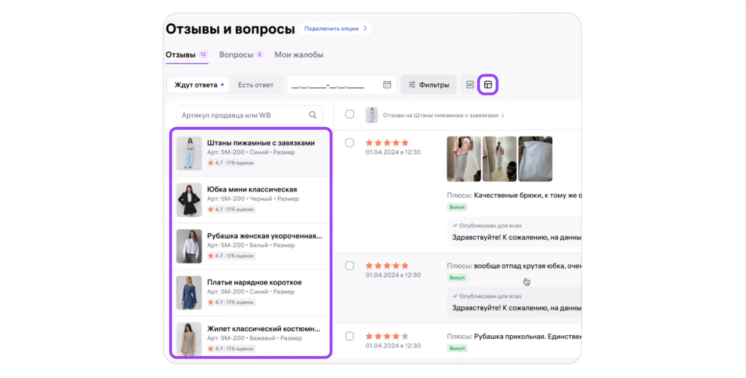 Для каждого отзыва покажем дату выкупа товара, его вариант или цвет, ШК заказа и статус. Если покупатель выбрал достоинства или недостатки товара из готового списка, покажем их в столбце с отзывом:
