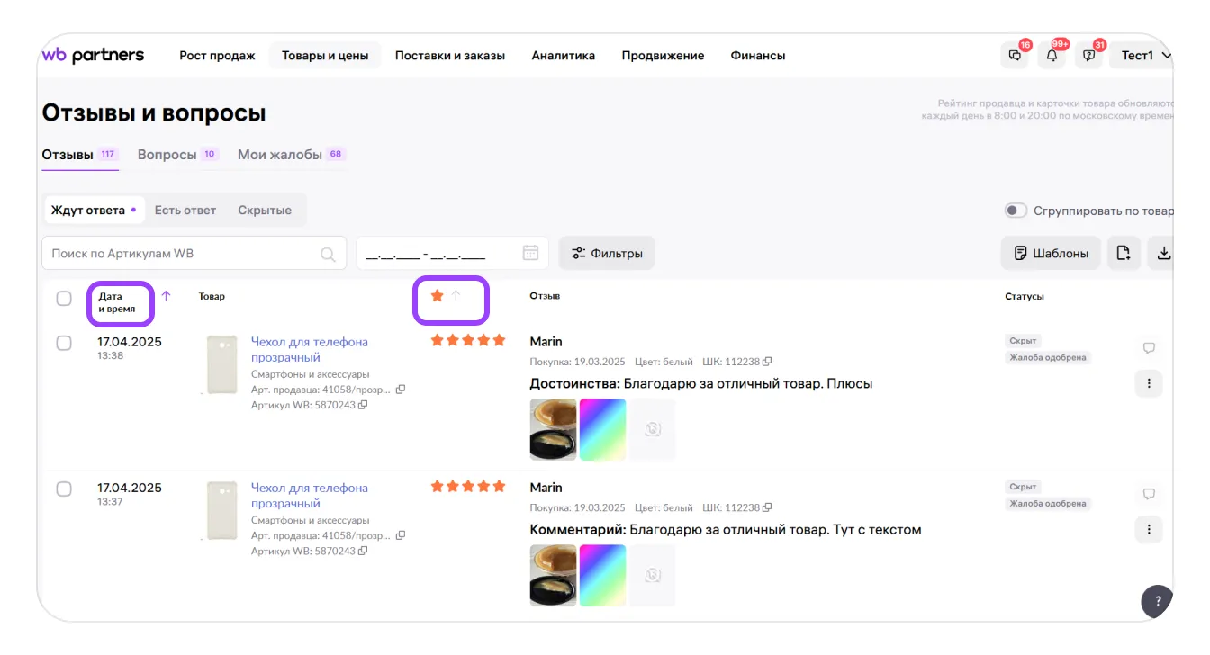 По умолчанию отзывы расположены в списке в хронологическом порядке — чем новее, тем выше в списке. Вы можете поменять их порядок на обратный или отсортировать по оценке товара — от высокой к низкой или наоборот. Для этого нажимайте на стрелочки напротив названий столбцов:
