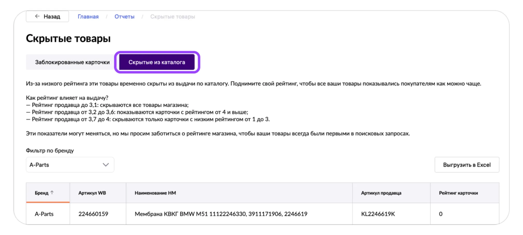 На этой вкладке показаны товары, которые были временно скрыты из выдачи по каталогу из-за низкого рейтинга магазина. Чтобы получить отчёт, выберите интересующий вас бренд, и таблица сформируется автоматически.
