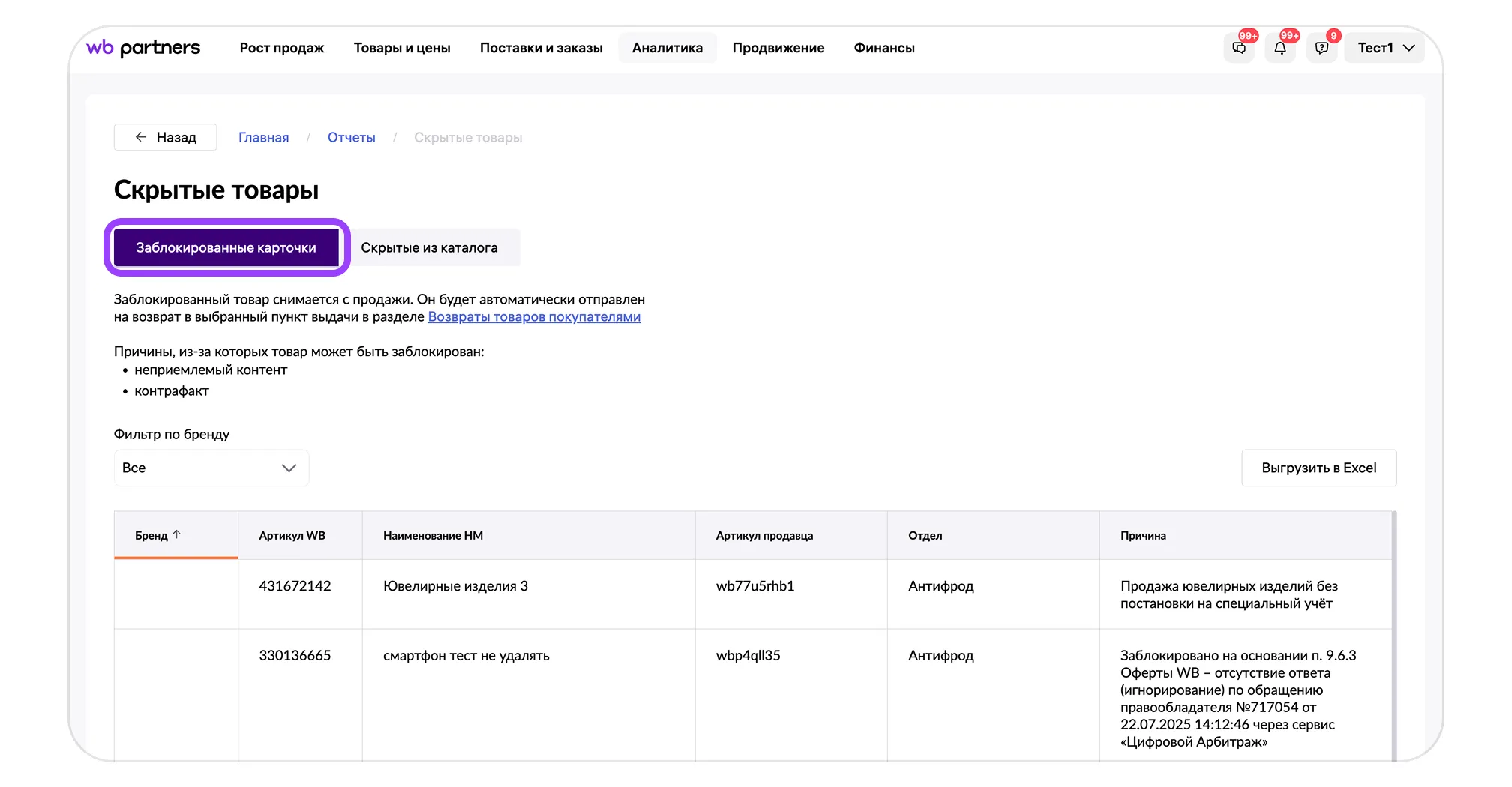 В таблице будут указаны карточки товаров, которые были заблокированы. Самые частые причины блокировки товара — это неприемлемый контент и контрафакт.