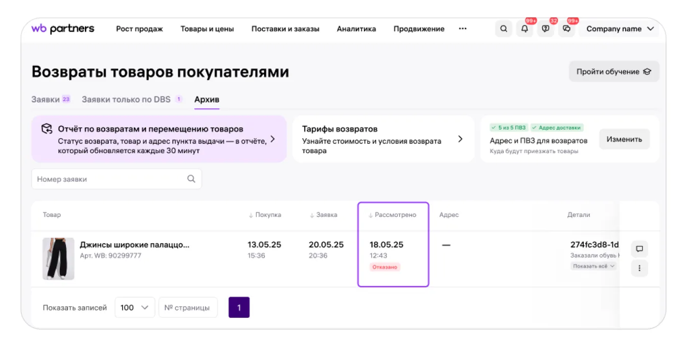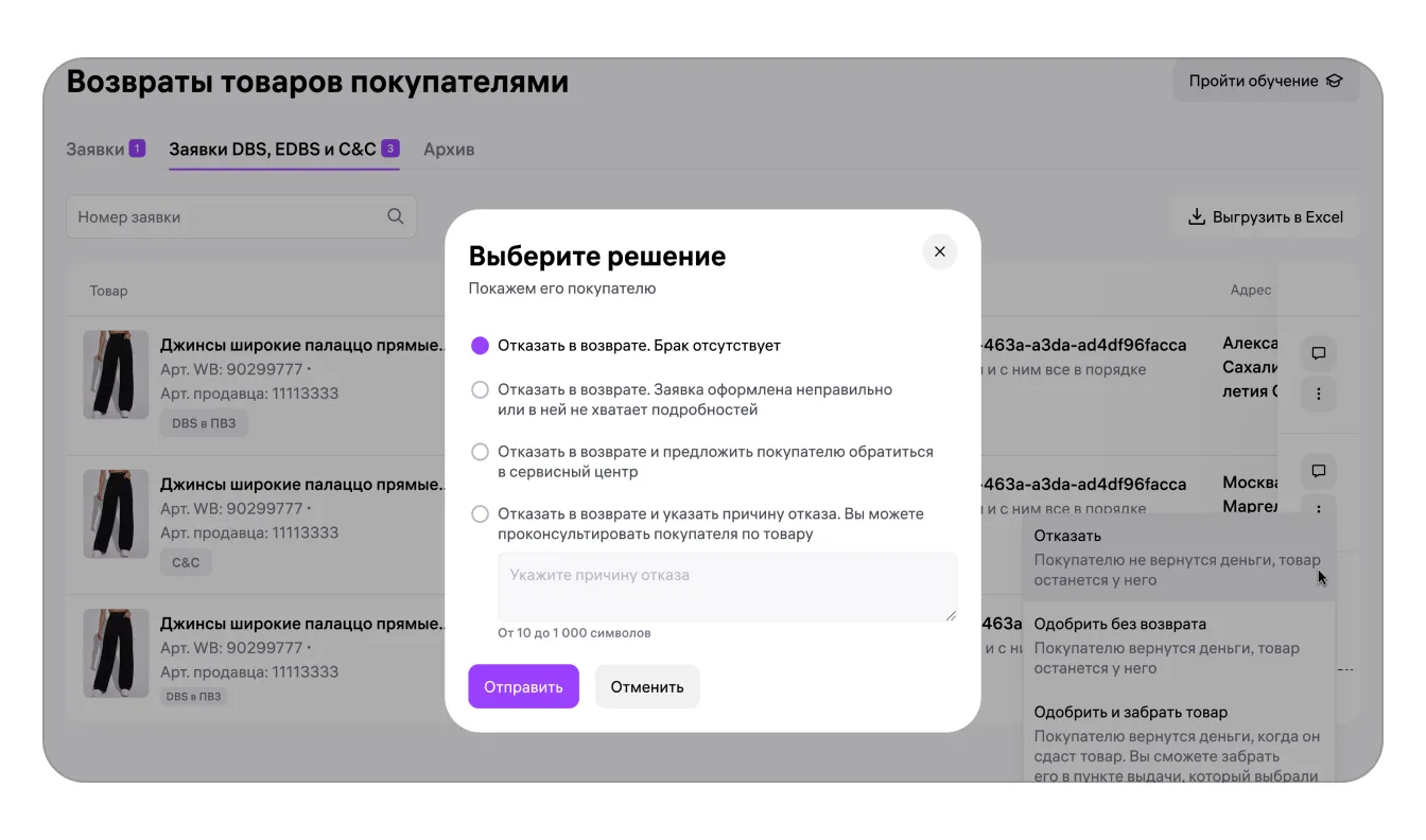 Одобрить и забрать товар — товар вернётся в ПВЗ, который указан на верхней панели страницы «Возвраты товаров покупателями» в плашке «Адрес и ПВЗ для возвратов».