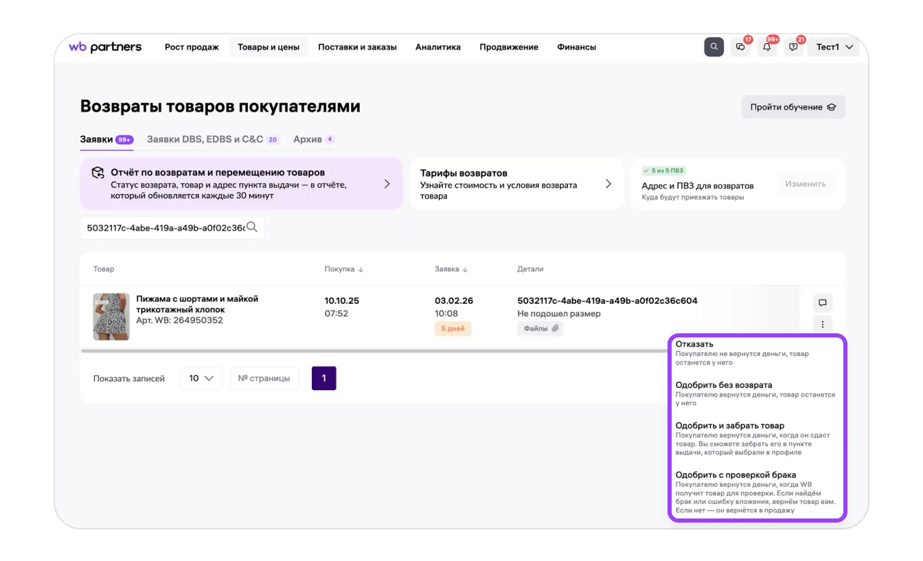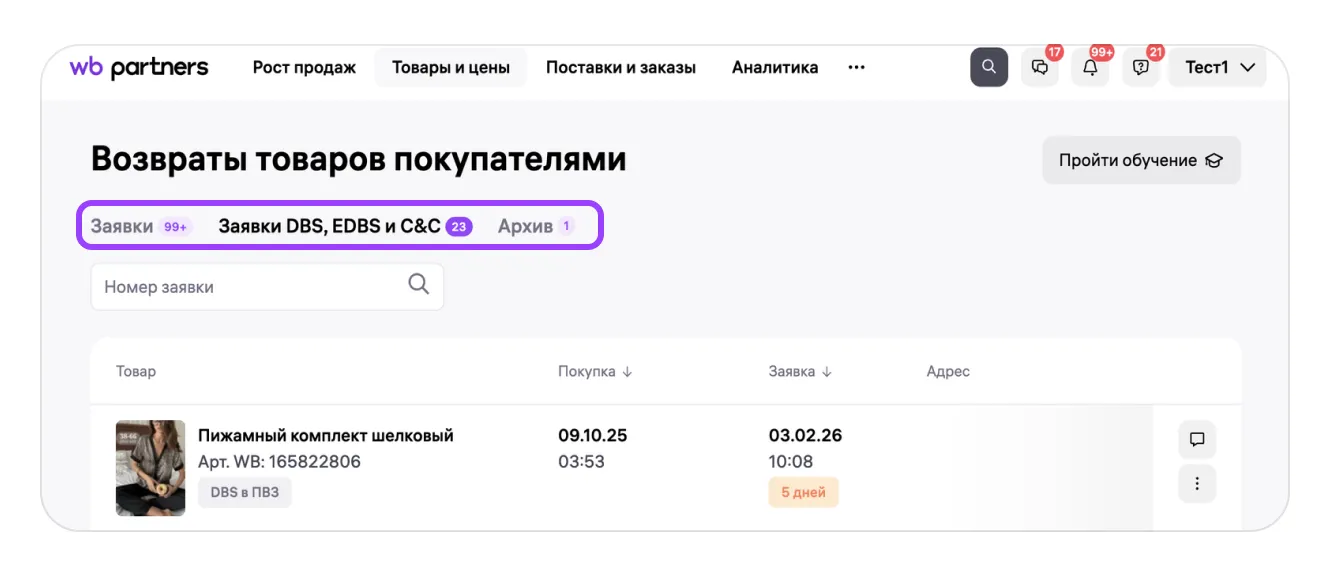 Откройте на портале: Товары и цены → Возвраты покупателей → вкладка «Заявки» или «Заявки только по DBS».