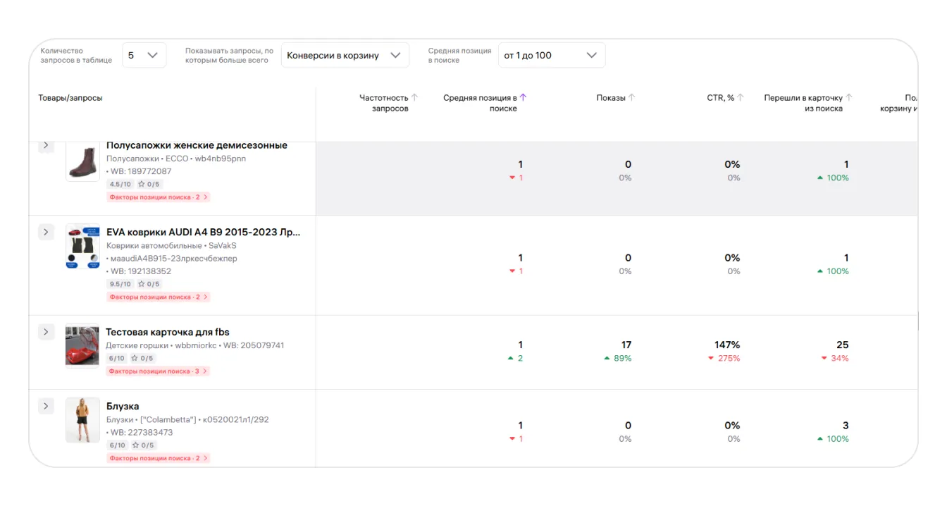 В таблице собраны данные по вашим товарам и их месту в поисковой выдаче в соотношении с товарами других продавцов. Здесь же показаны запросы, по которым покупатели находят ваши товары в поиске, факторы, которые повлияли на позицию ваших карточек, и рекомендации по улучшению позиций.