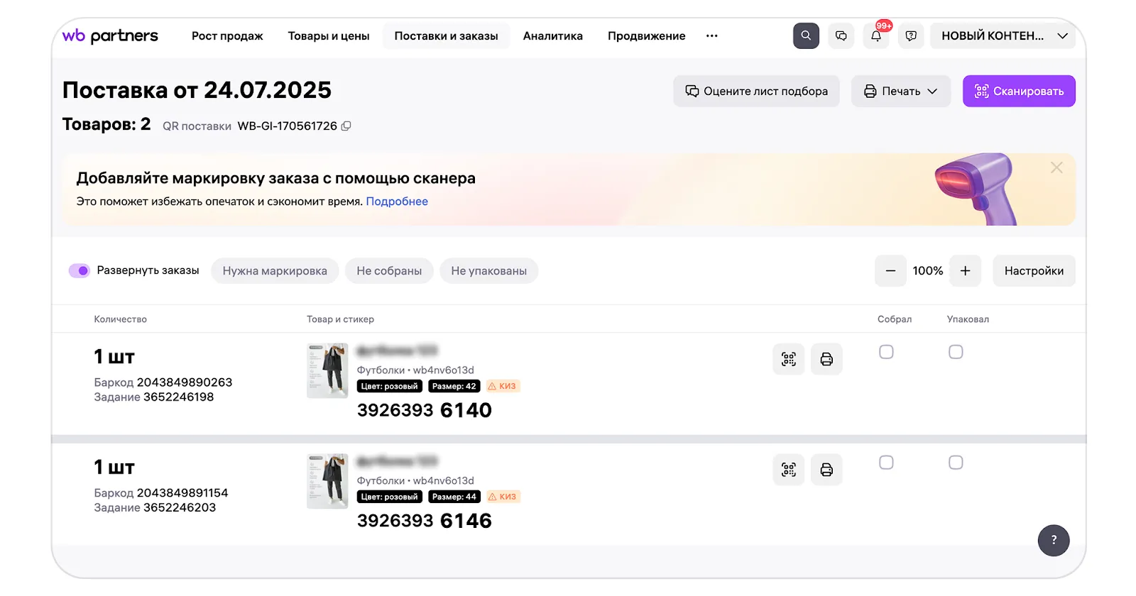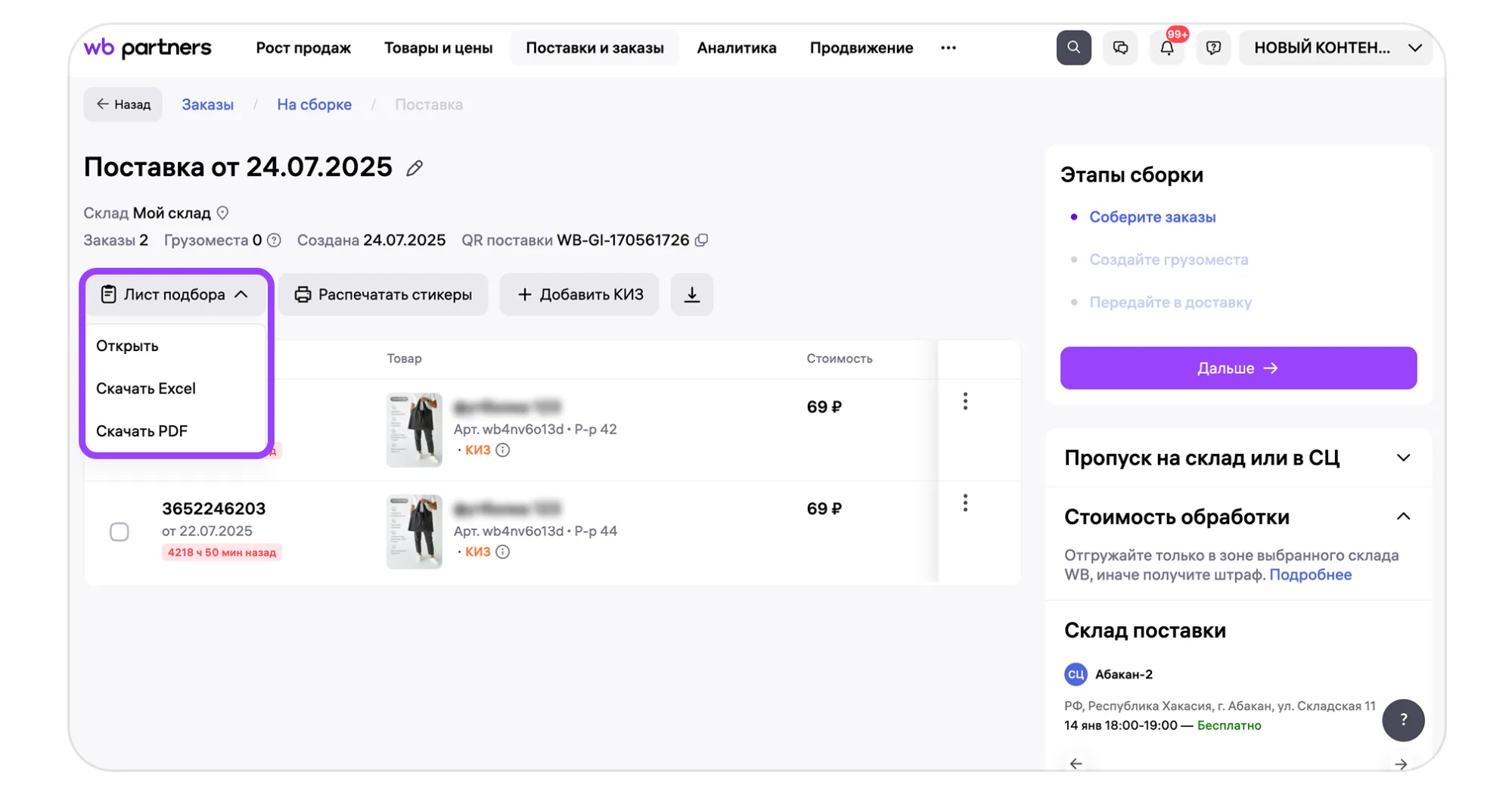 Лист подбора — это список заказов, которые включены в поставку, со всей необходимой информацией о них: наименованием, размером, цветом, количеством, артикулом, баркодом, стикерами. У каждой поставки — свой лист подбора, который формируется автоматически, как только вы добавляете заказы в поставку.