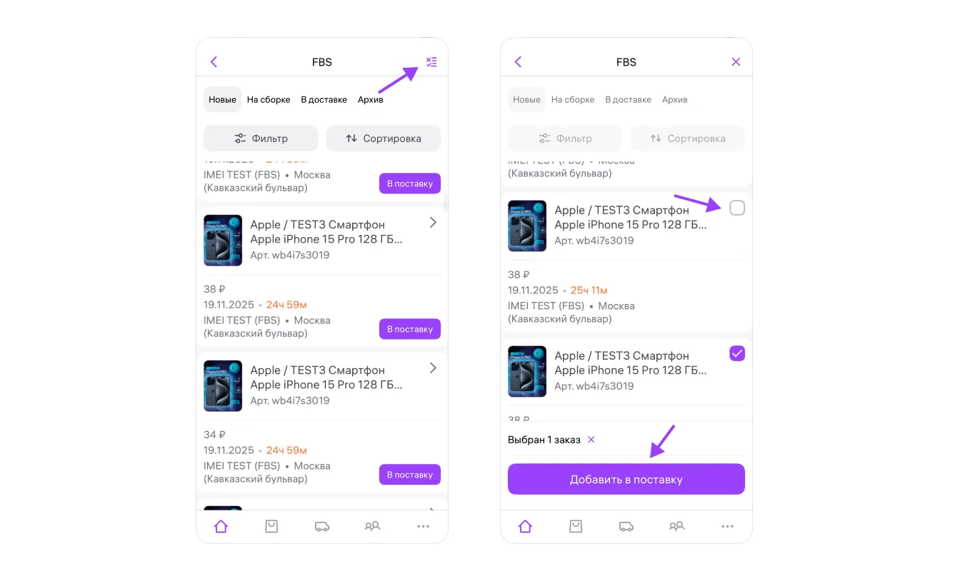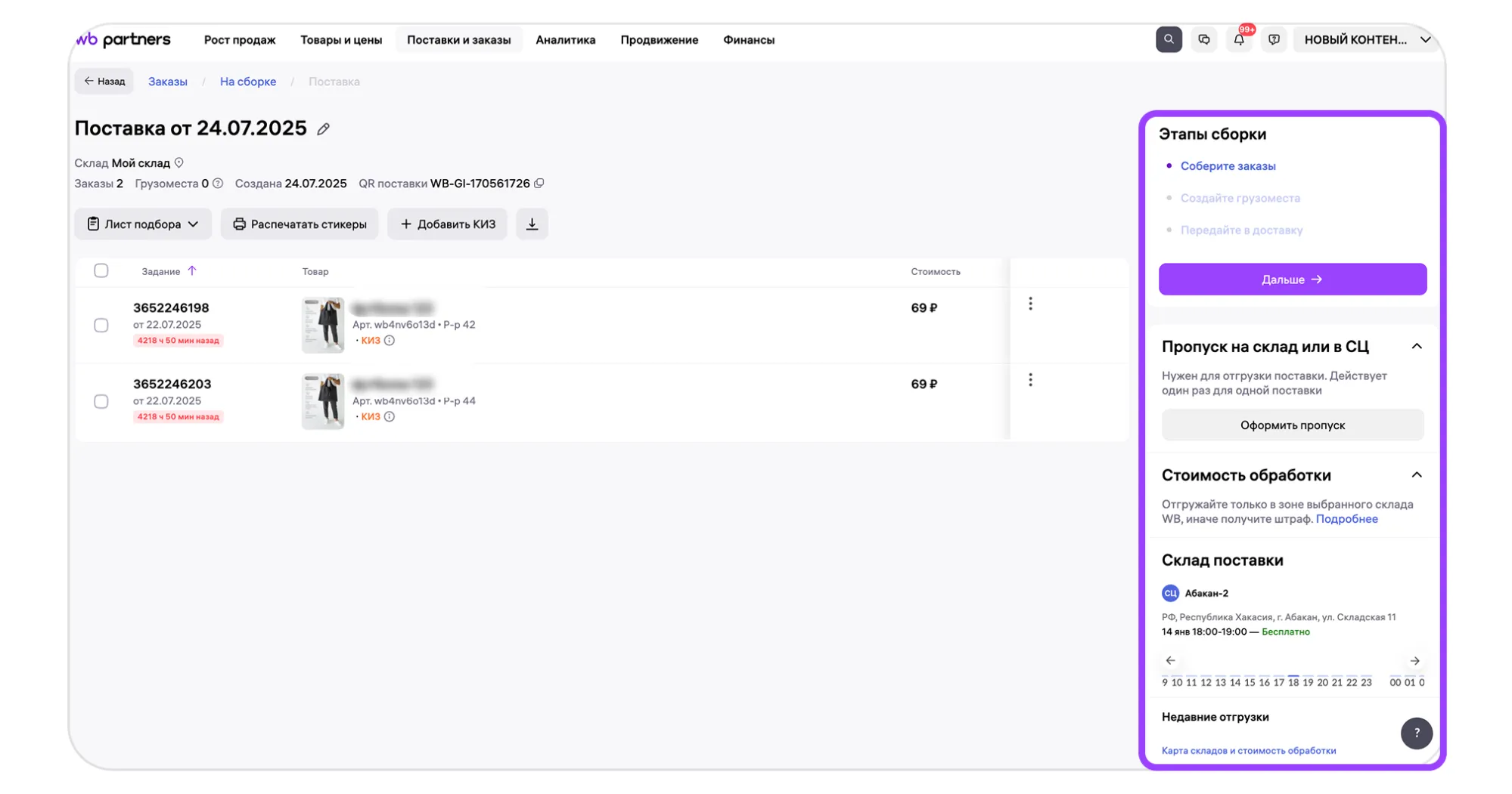 Поставка — это один или несколько заказов, которые вы объедините и повезёте на склад, в сортировочный центр или ПВЗ. Чтобы создать поставку: