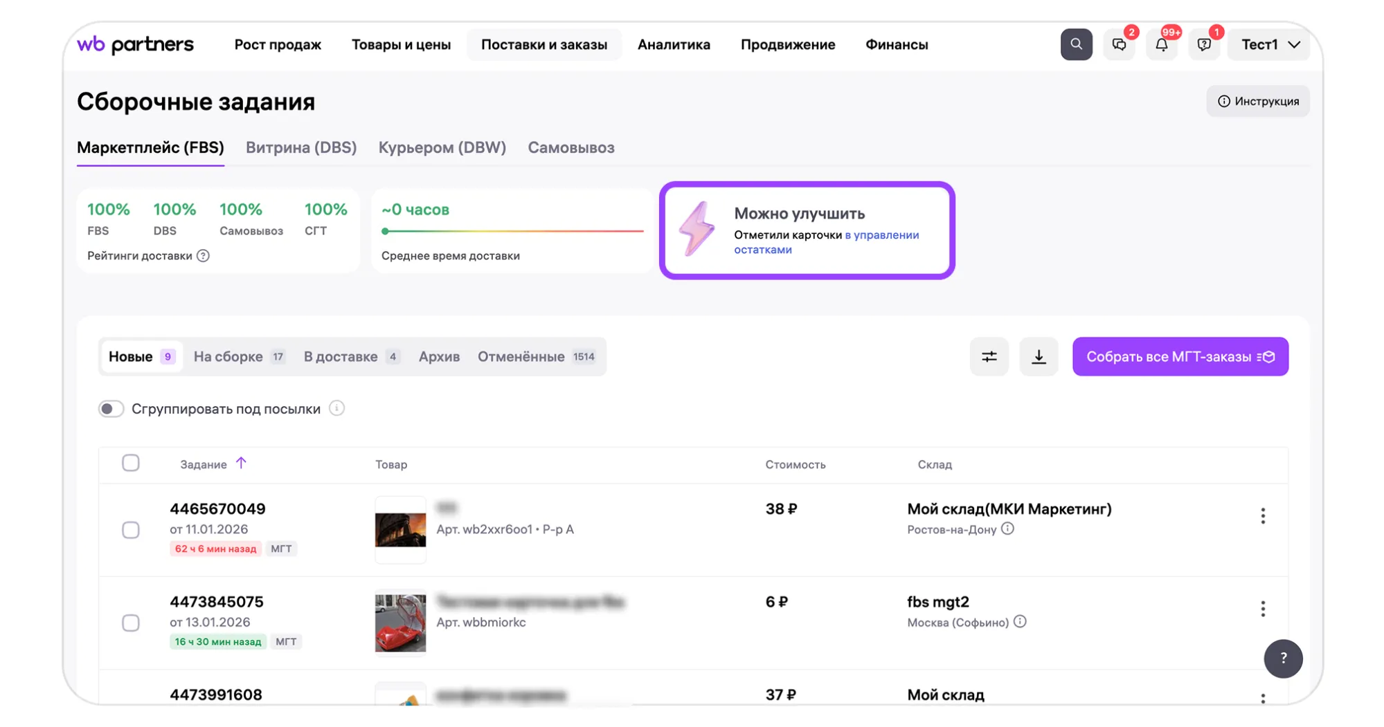 Когда покупатель оформляет заказ на ваш товар, на портале WB Partners автоматически появляется сборочное задание. В нём вы увидите, какой товар нужно упаковать и отгрузить, а также сколько времени прошло с момента поступления заказа.