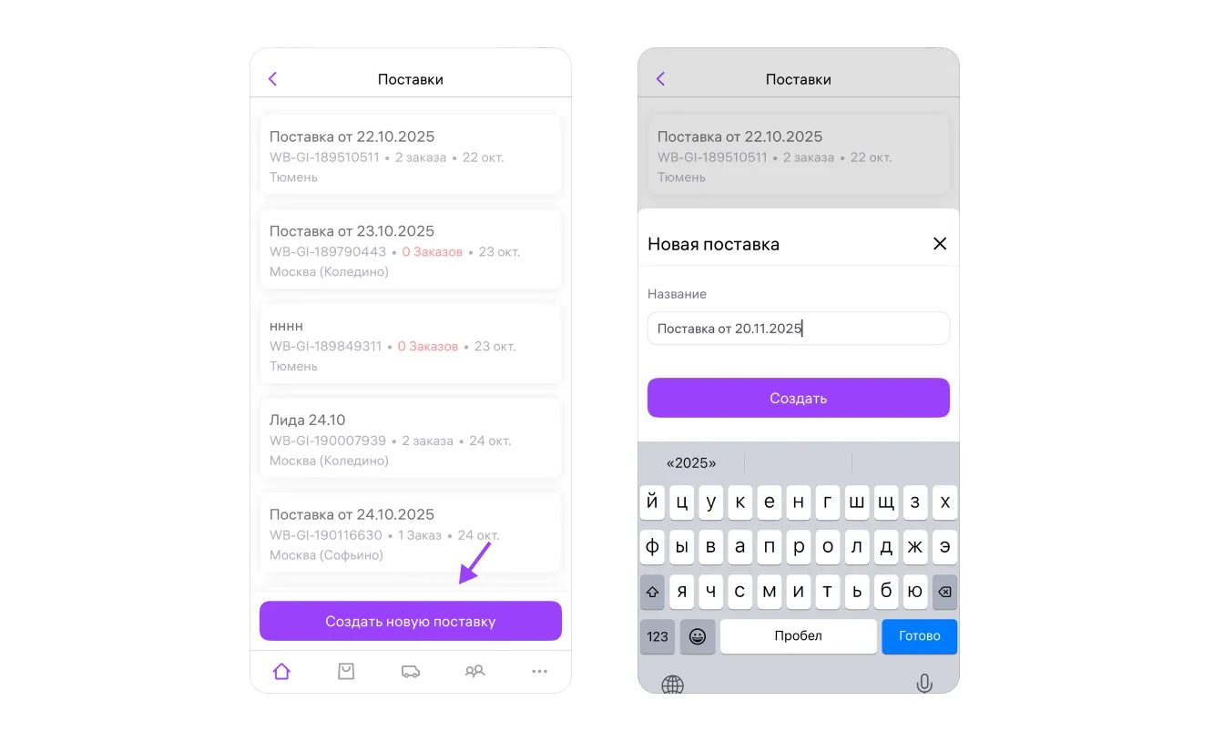 Нажмите «Создать поставку» или «+ Новая поставка».