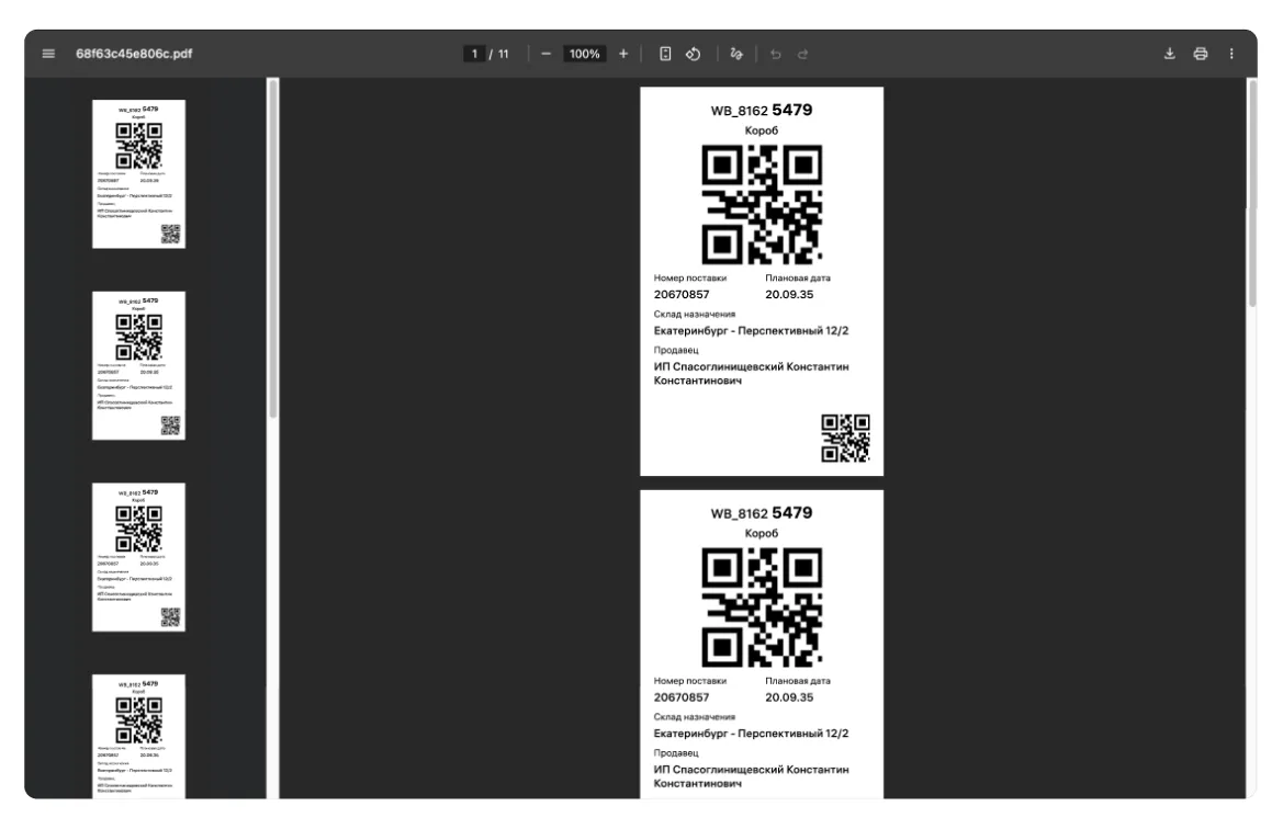 На прошлом этапе вы добавили товары в короба и выбрали дату поставки. Следующий этап — оформление штрихкодов.
