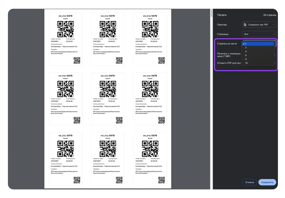Настройка может называться по-разному в зависимости от браузера. Мы рекомендуем использовать браузер Google Chrome — в нём нужное поле называется «Страниц на листе». На одном листе А4 можно разместить до 16 QR-кодов.