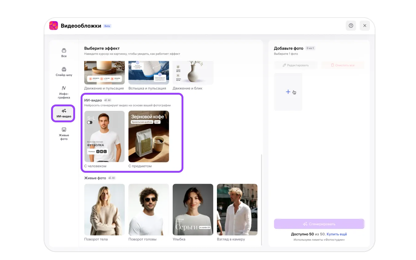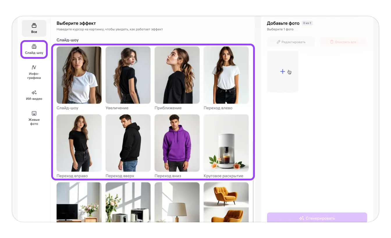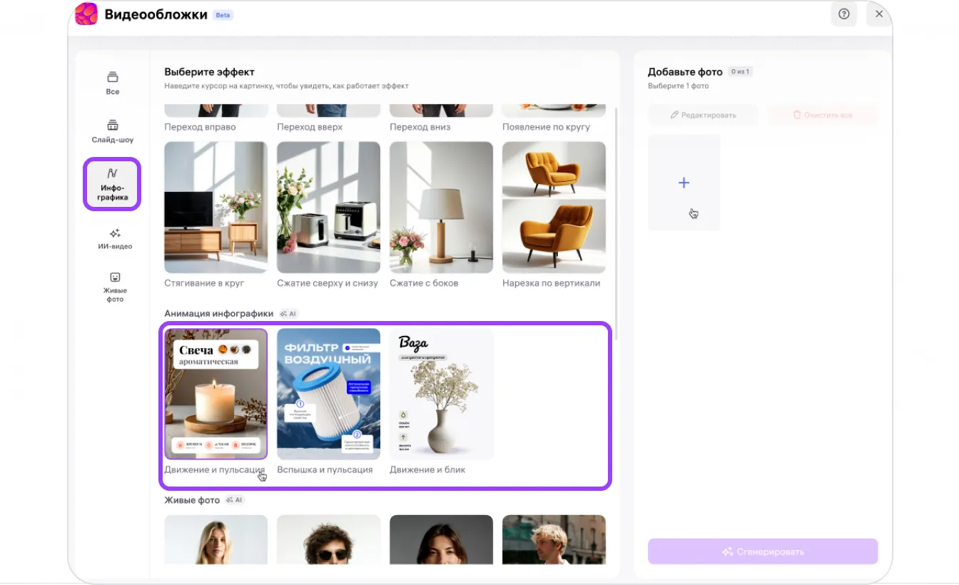 Чтобы создать ИИ-видео, выберите эффект и соответствующее фото: с человеком или с предметом. Нейросеть проанализирует фото и создаст видеообложку на основе снимка.