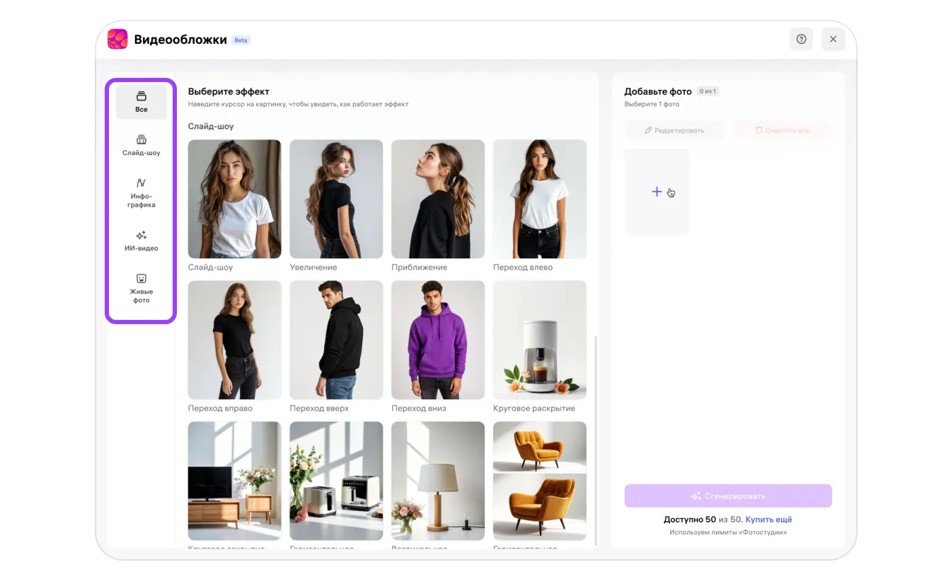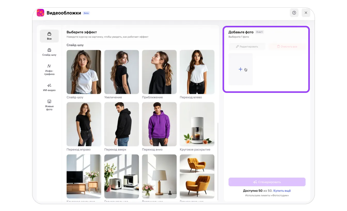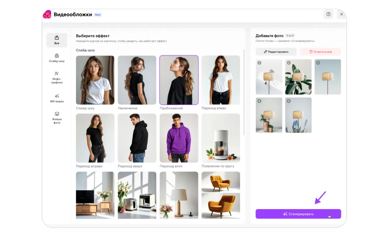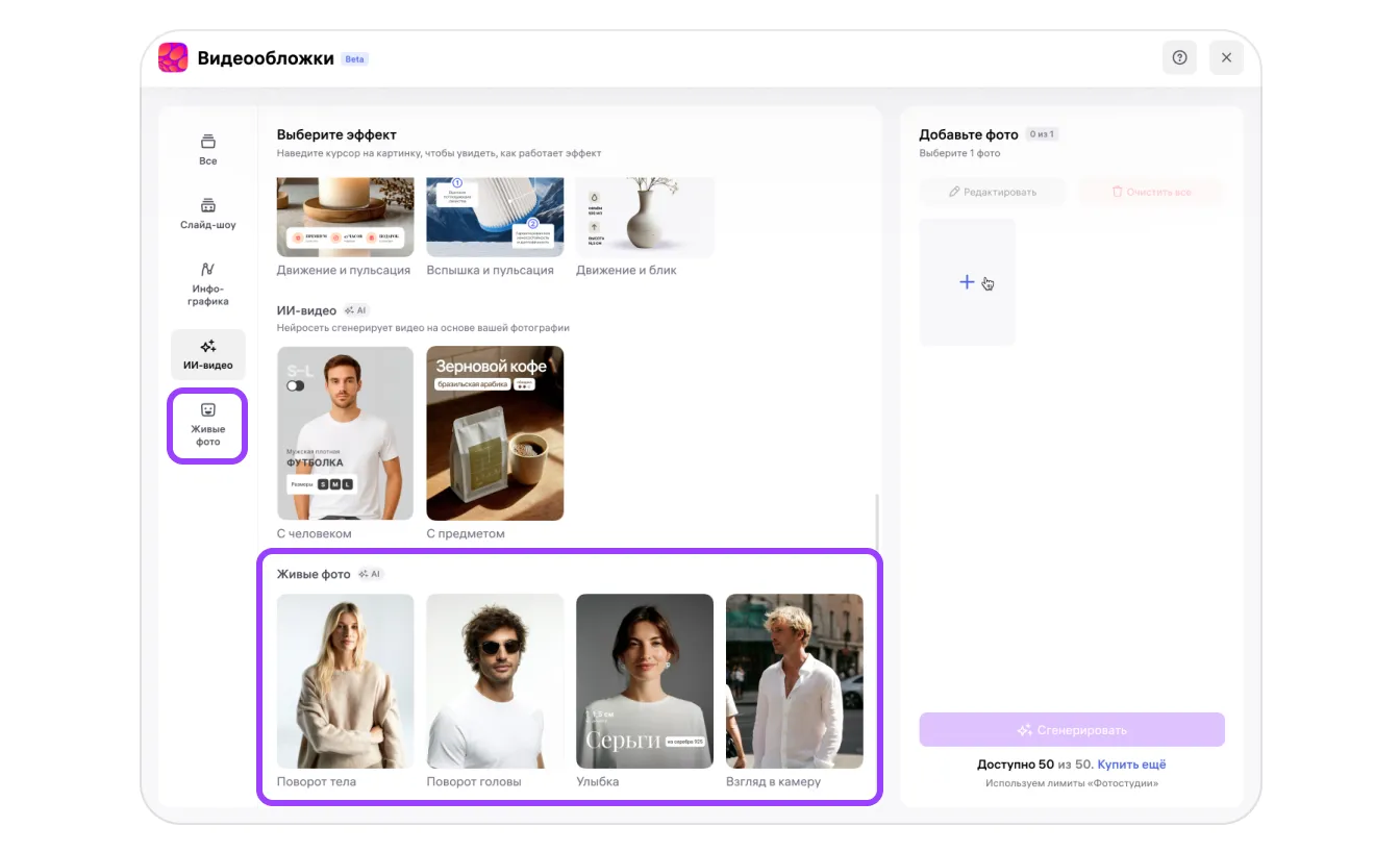 Чтобы создать ИИ-видео, выберите эффект и соответствующее фото: с человеком или с предметом. Нейросеть проанализирует фото и создаст видеообложку на основе снимка.