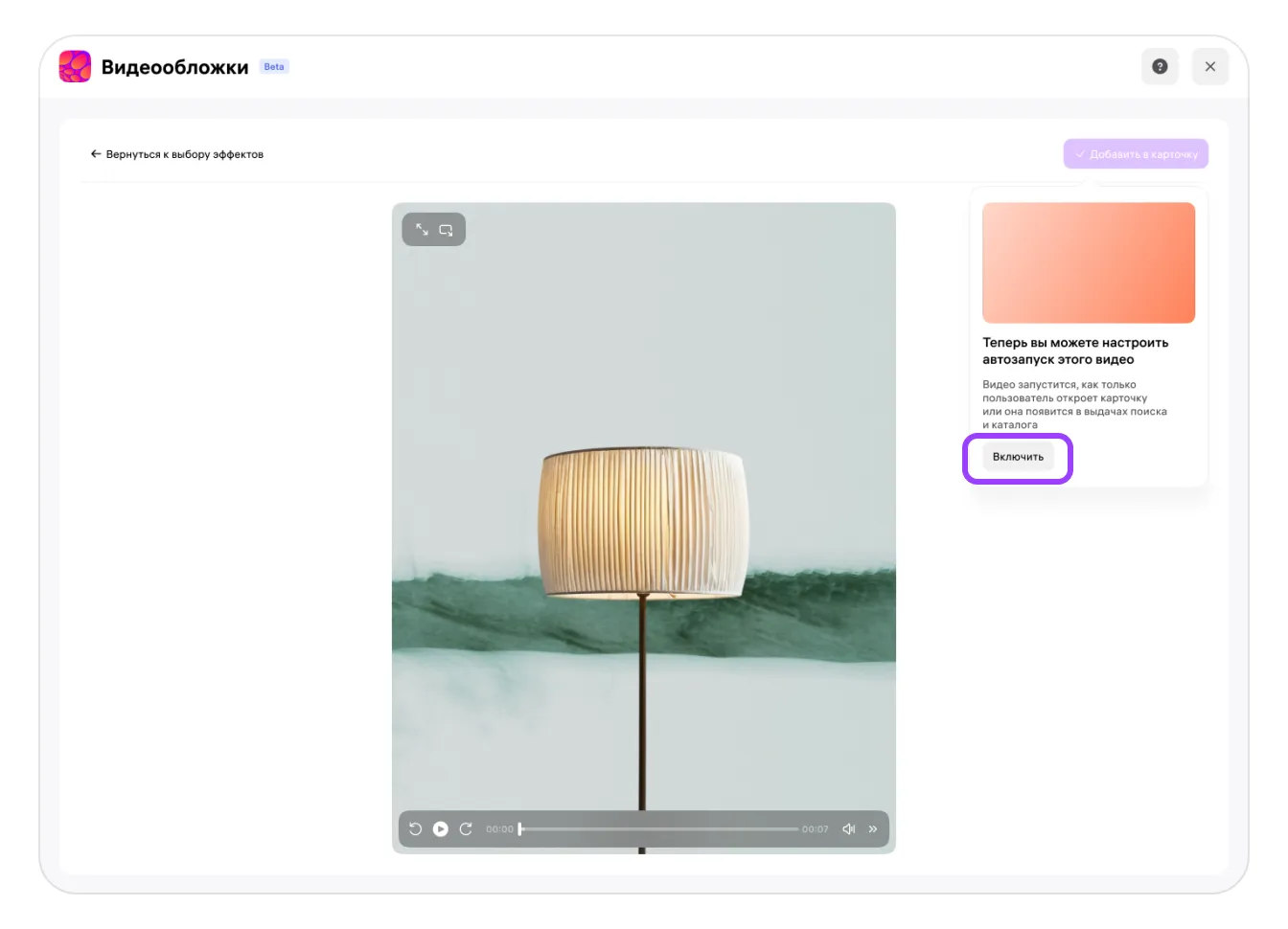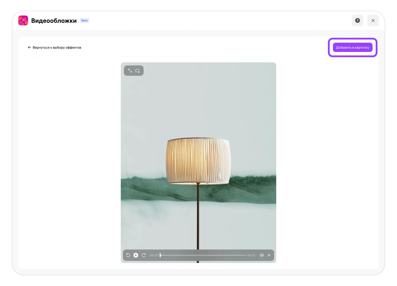 Посмотрите сгенерированную видеообложку. Если она вам подходит, нажмите «Добавить в карточку». Если нет, нажмите «Вернуться к выбору эффектов». Созданное видео не сохранится, и вы сможете создать видеообложку заново.