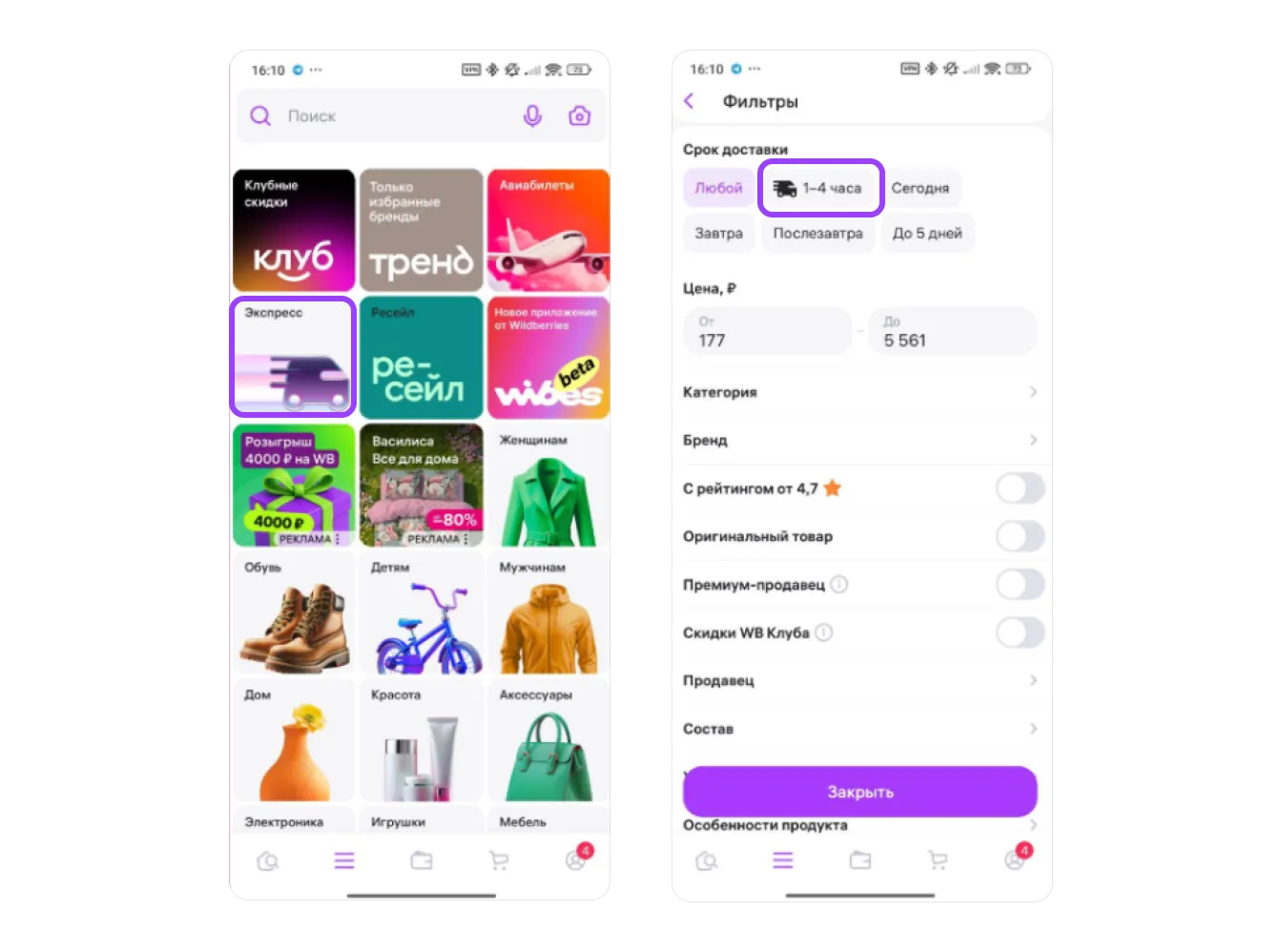 удобный поиск товаров для покупателей – товары отображаются в отдельном разделе меню «Экспресс» и в фильтре срока доставки «1-4 часа».