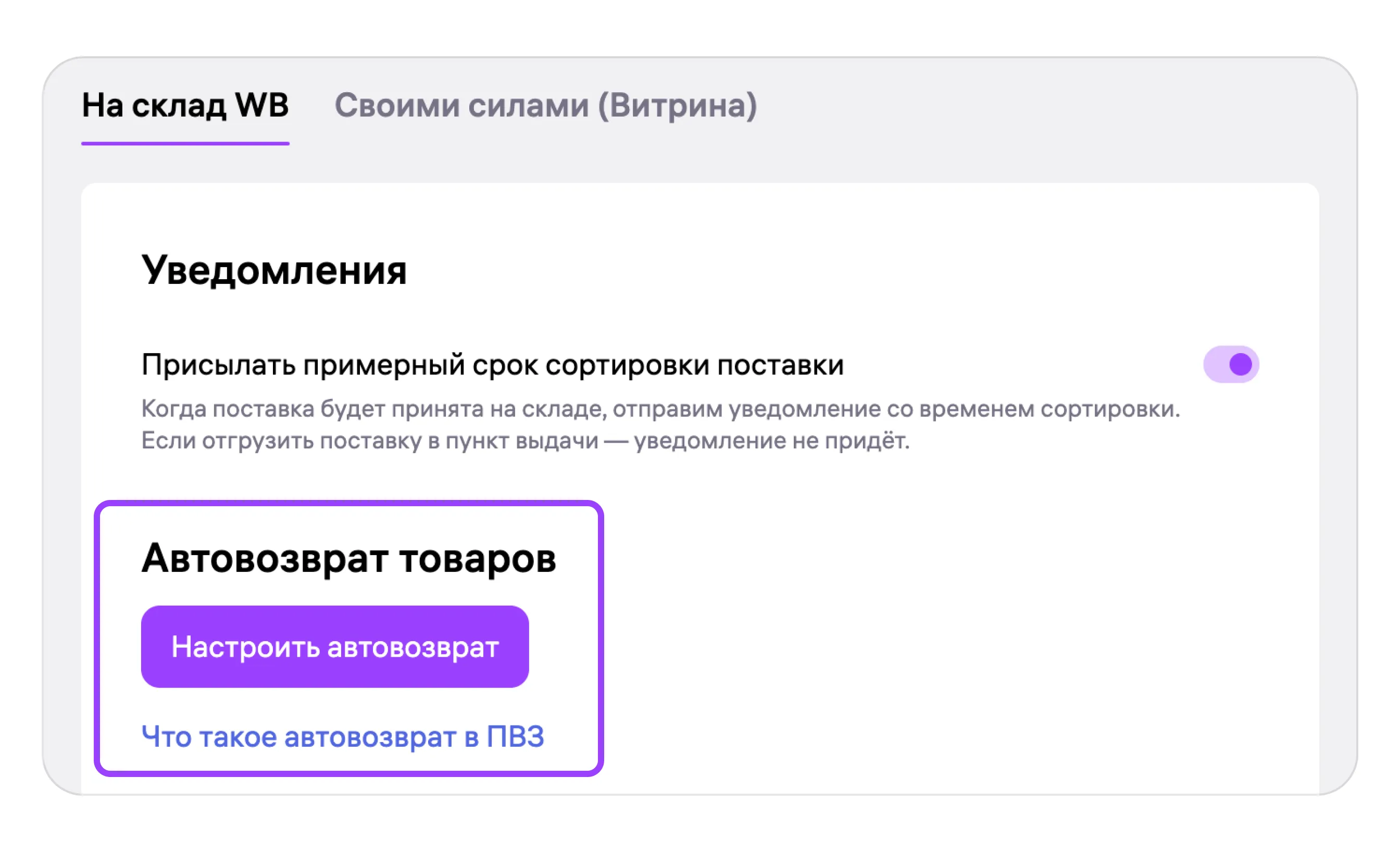 Зайдите: Маркетплейс → Настройки → На склад WB → Настроить автовозврат.