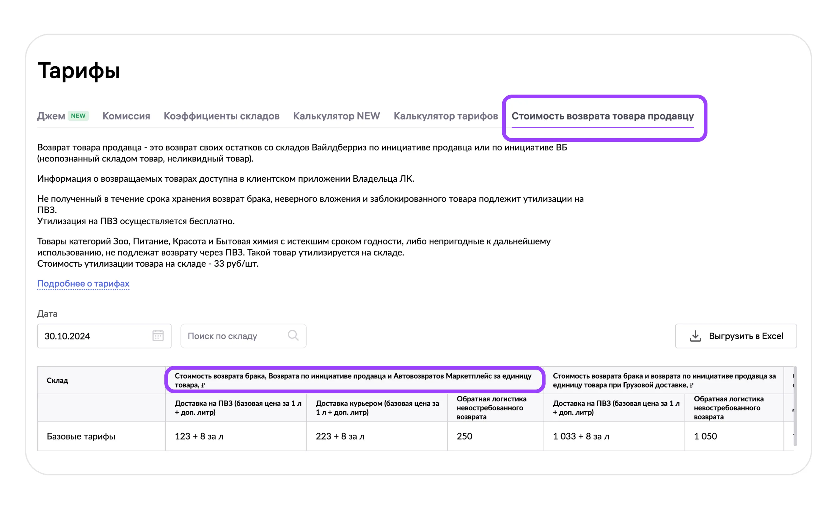 Стоимость автовозврата по модели «Маркетплейс» (FBS) смотрите: Тарифы → Стоимость возврата товара продавцу → Стоимость возврата брака, Возврата по инициативе продавца и Автовозвратов Маркетплейс за единицу товара, ₽.