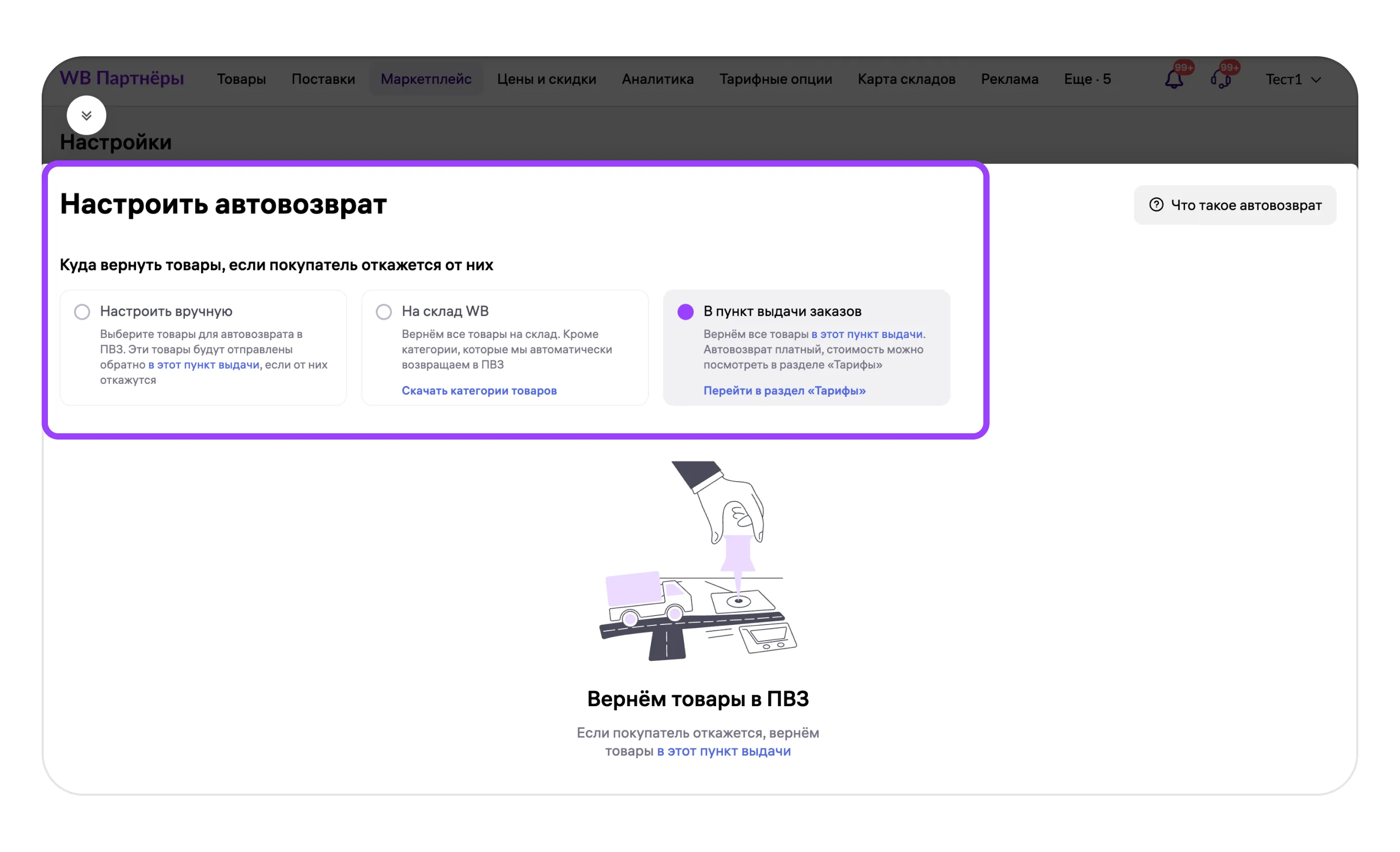 Для модели «Маркетплейс» (FBS) можно настроить автовозврат товара.
