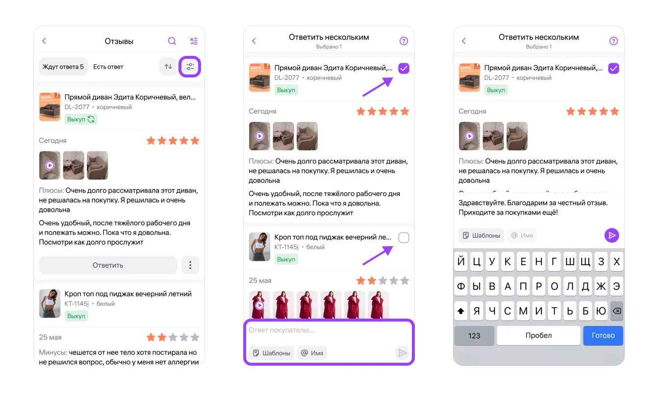 Ждут ответа — отзывы, на которые вы ещё не ответили — с текстом, фото, видео или указанием недостатков из готового списка.