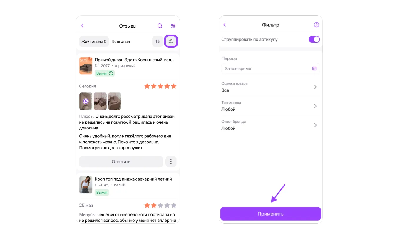 Чтобы установить фильтры, нажмите соответствующий значок в правом верхнем углу. Здесь вы также можете сгруппировать отзывы по артикулу. Выберите нужные фильтры и нажмите «Применить».