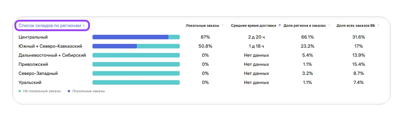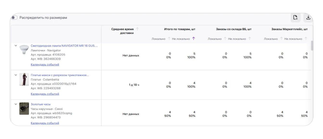 Данные помогут понять, насколько эффективно распределены ваши остатки и стоит ли перенести часть товаров на другие склады, чтобы сократить сроки доставки и уменьшить количество нелокальных заказов.