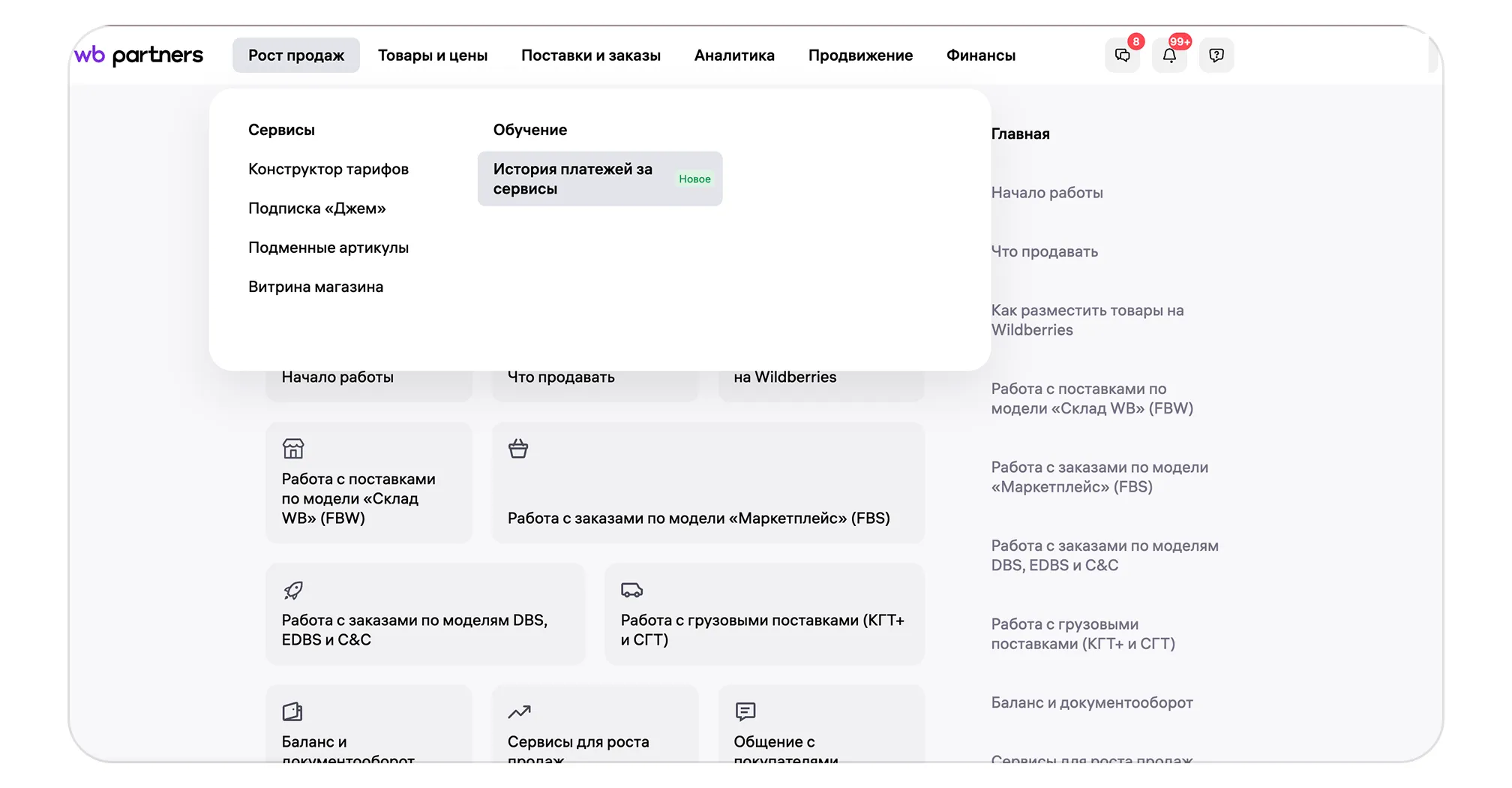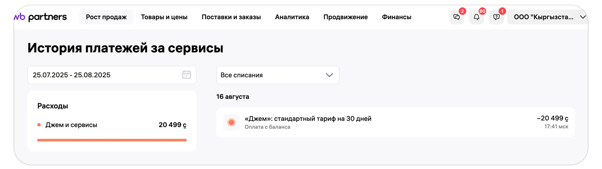История платежей за сервисы — страница в разделе «Рост продаж» с информацией по платежам за подписку «Джем» и её сервисы.