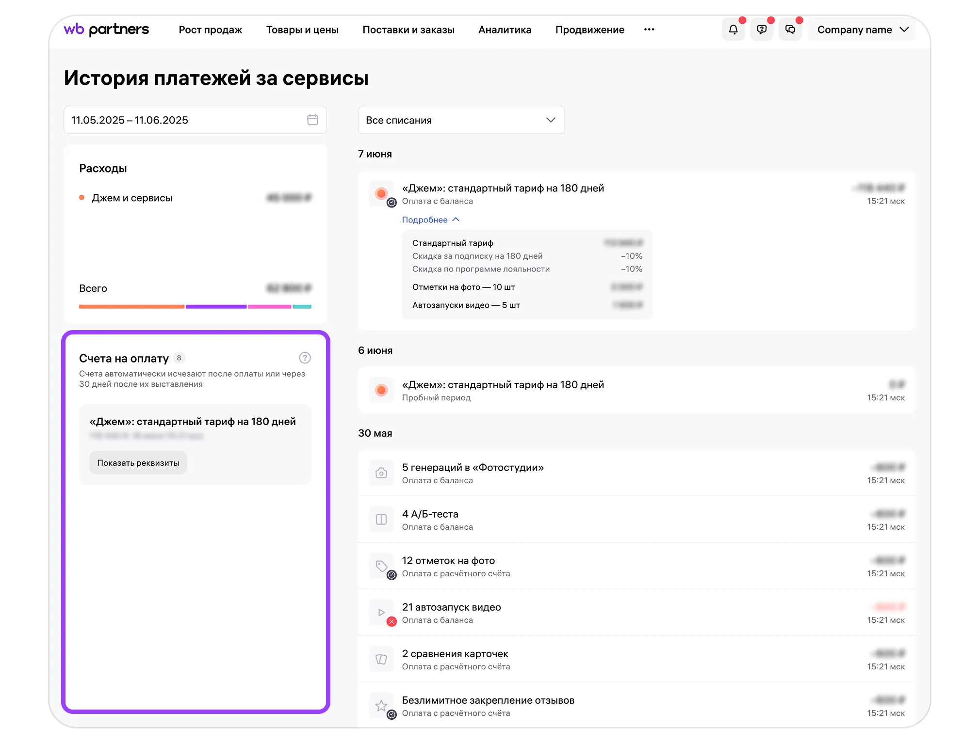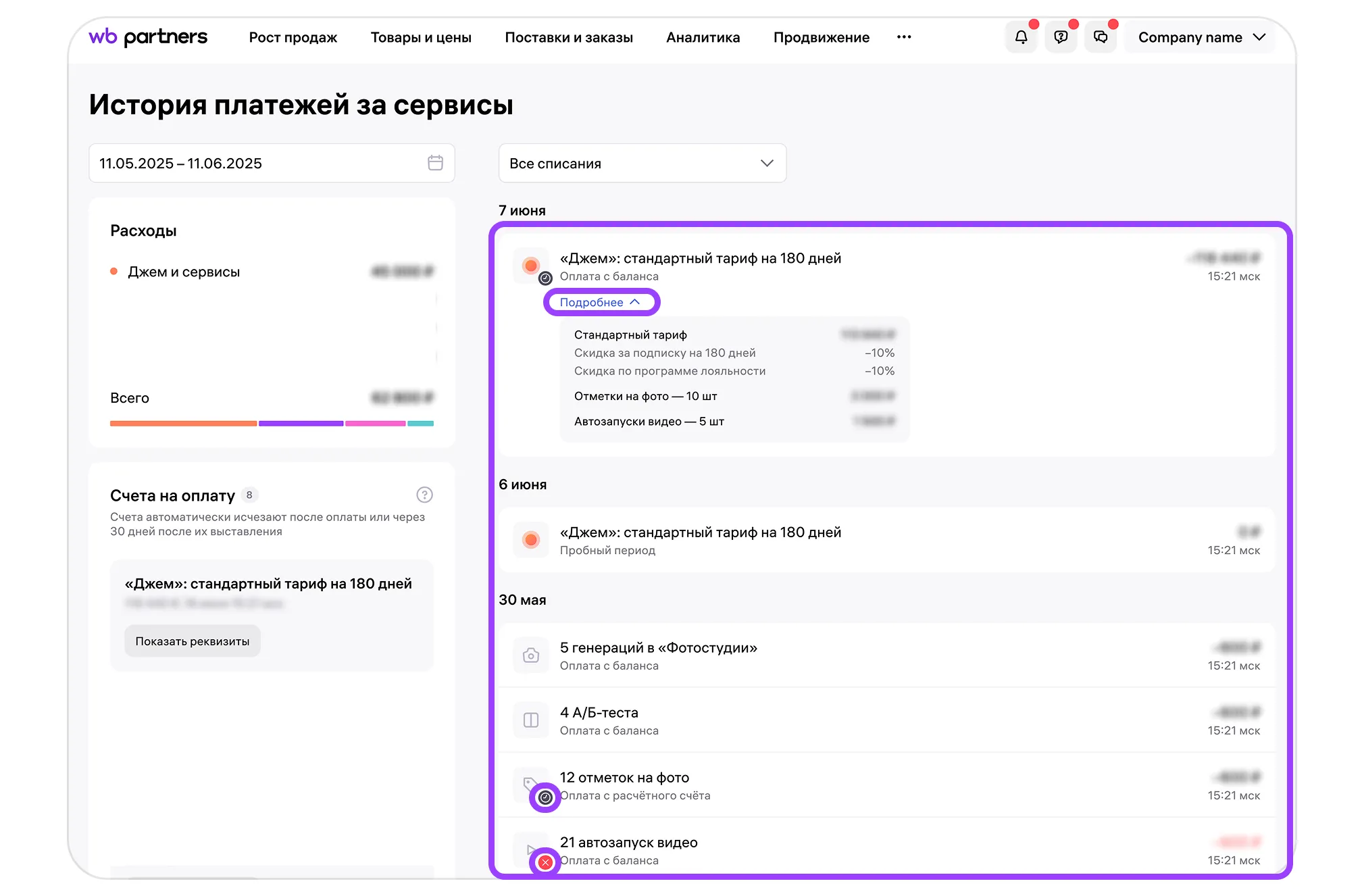 В этом разделе отображается история всех платежей за сервисы — независимо от того, оплачивали вы с баланса или через расчётный счёт
