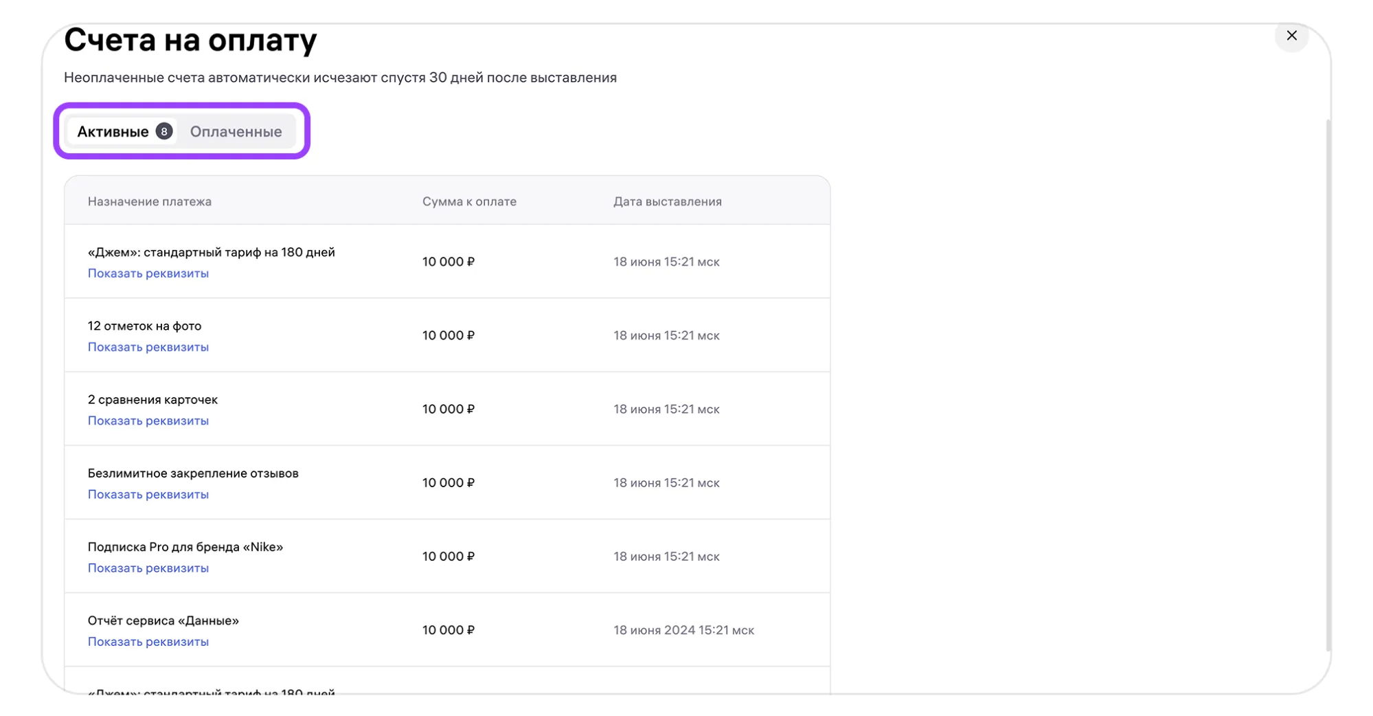 Если счетов на оплату больше трёх, снизу вы увидите кнопку «Показать все счета». По нажатию откроется окно со всеми счетами. Переключитесь между вкладками, чтобы посмотреть активные и оплаченные.