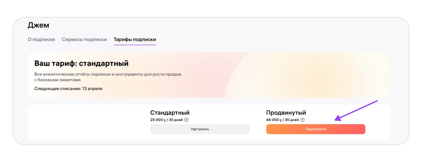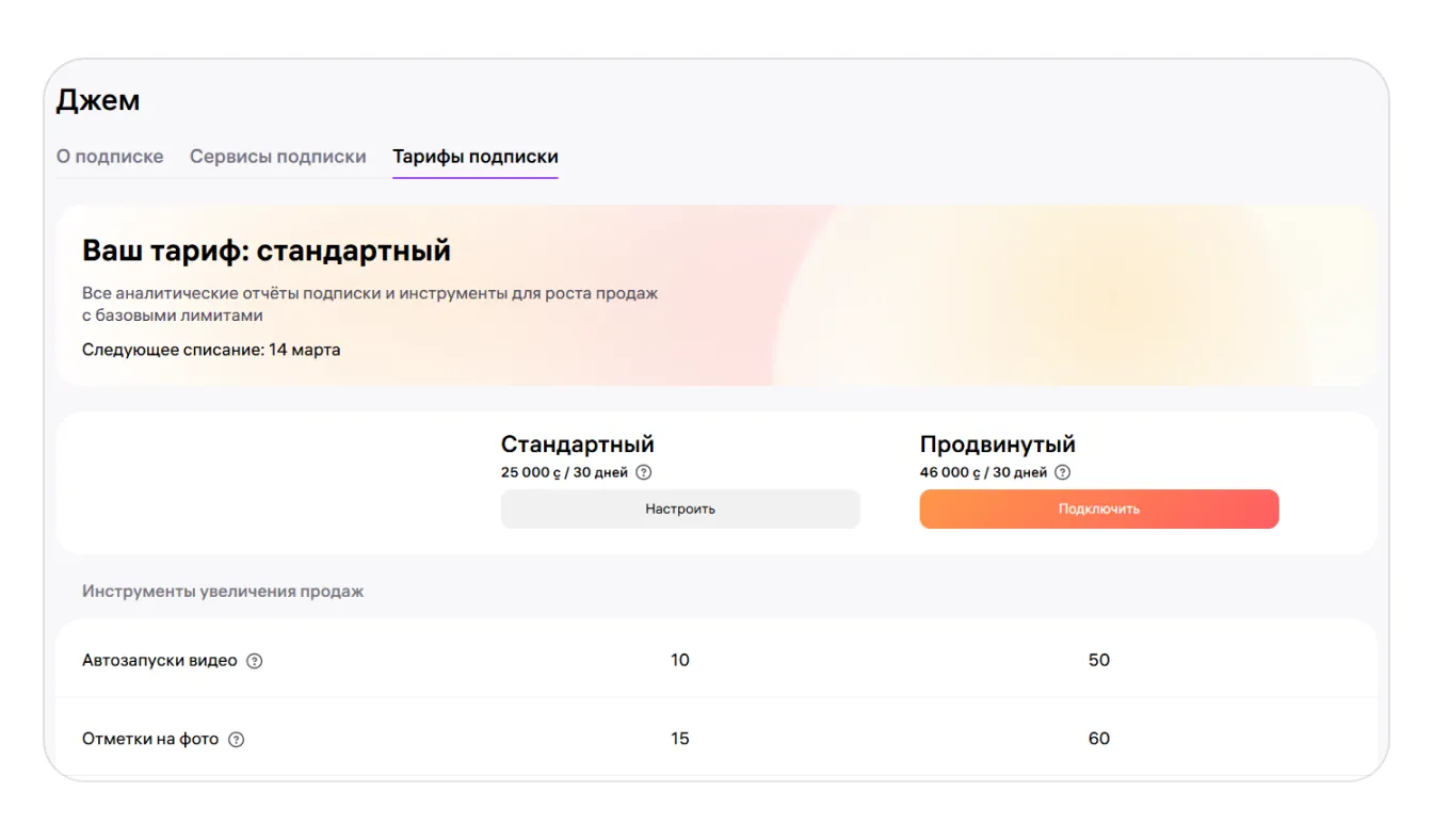 1. Для этого перейдите Рост продаж → Подписка «Джем» → Тарифы подписки.
