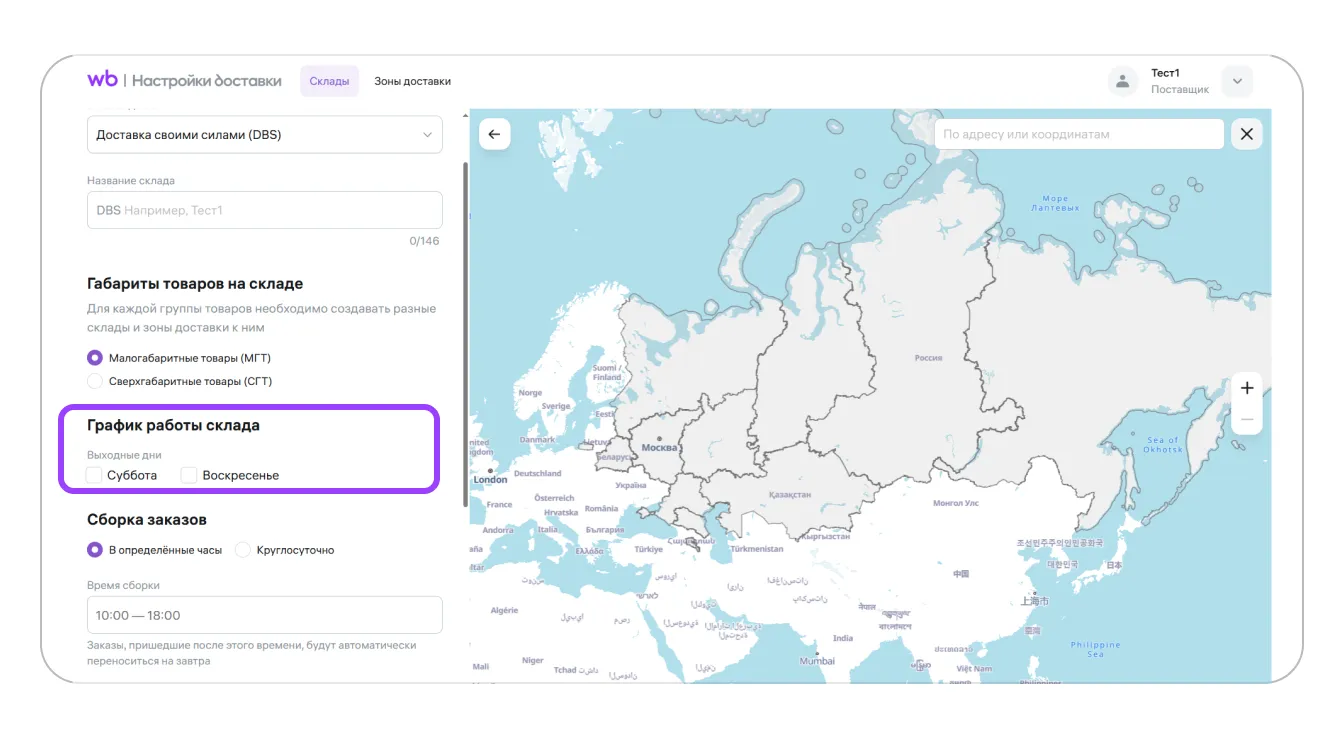 График работы склада. Если у склада есть выходные дни — суббота или воскресенье, отметьте их галочкой. Если у вашего склада нет выходных, то оставьте поля пустыми.