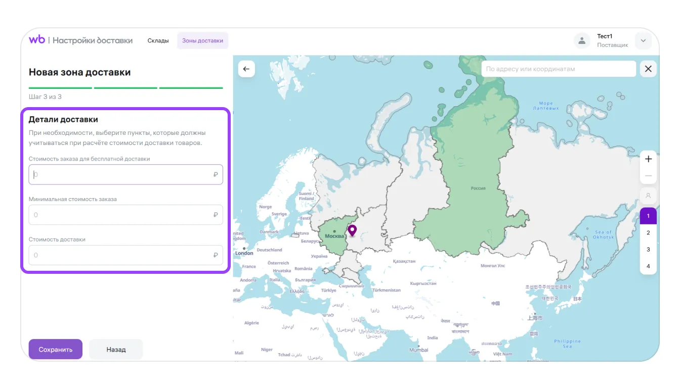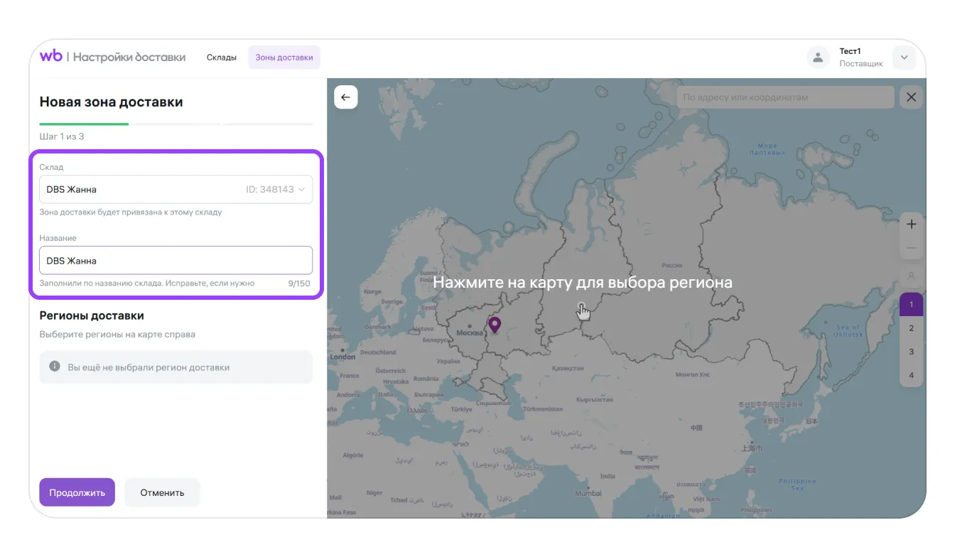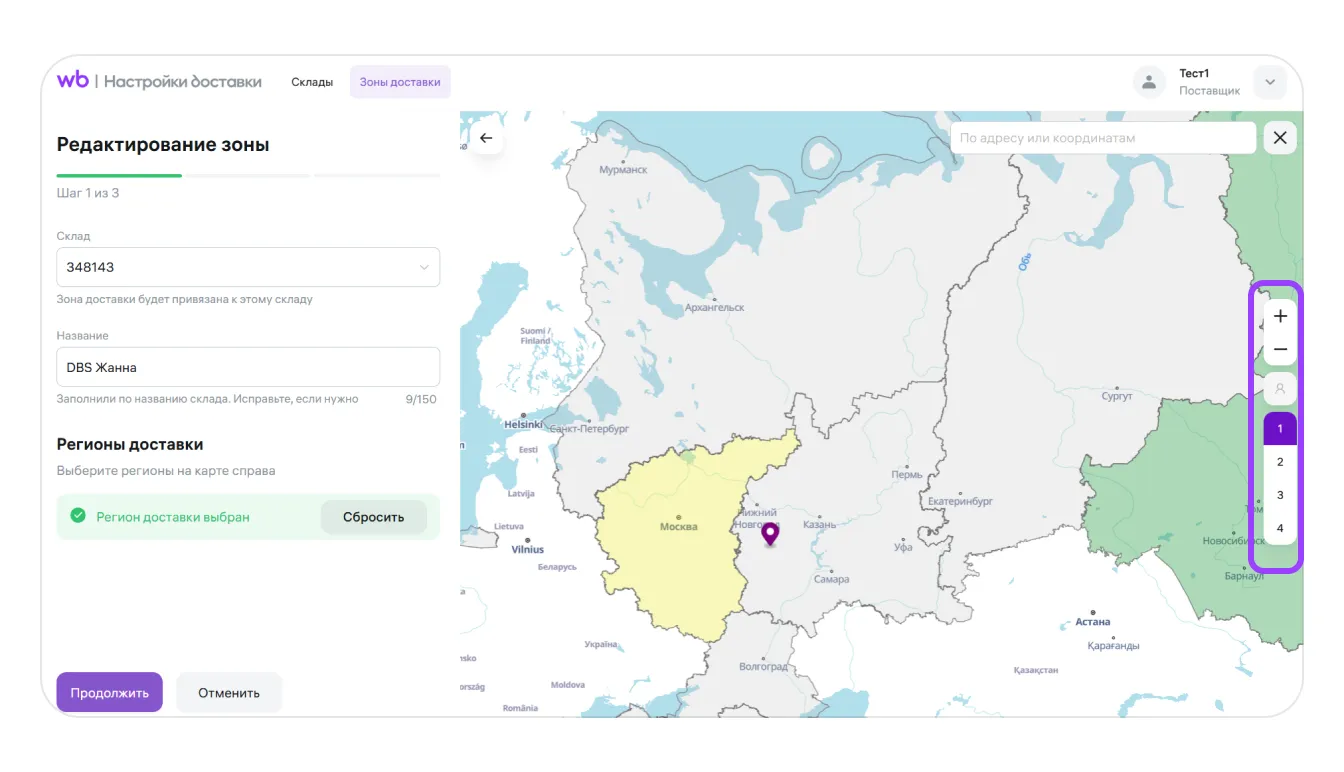 Можно привязать несколько зон доставки к одному складу — это удобно, если вы отправляете товар из одного места в разные регионы
