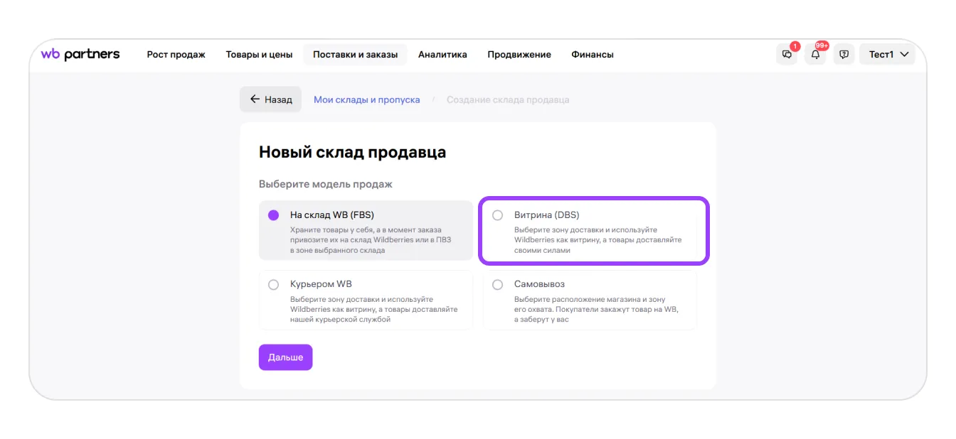 Чтобы начать работать по модели «Витрина» (DBS), нужно создать на портале WB Партнёры виртуальный склад продавца и зону доставки.
